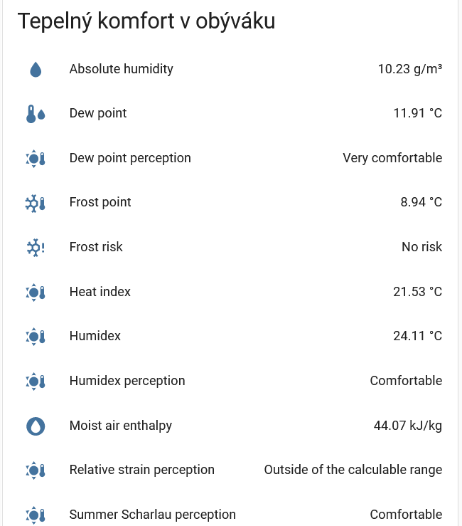 Dnes je vonku fakt príjemnerva píše: stř čer 19, 2024 6:27 pmKdyž měřím teplotu a relativní vlhkost venku a v místnosti, mohu určit absolutní vlhkost (tedy kolik g vody je v m3 vzduchu). Abych to nemusel počítat (nebo spíš odečítat z tabulek), je na to pěkná integrace pro HA - Tepelný komfort