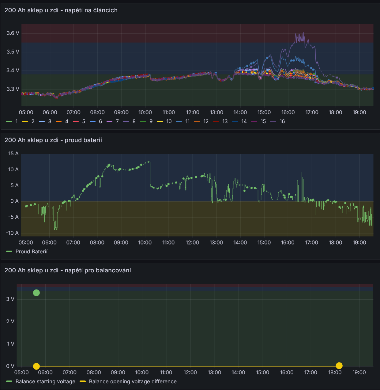 Celkem nepříjemná věc. JK-BMS nesepnulo balancování i když mělo a napětí na jednom článku dál rostlo dokud nedosáhlo nastaveného horního napětí 3.6 V a až pak JK-BMS vypnulo dobíjení. Protože mám paralelně 4 sady baterií, tak odpojení jedné nevadilo, vše fungovalo normálně. U všech JK-BMS je nastavení podobné a ty ostatní v případě potřeby balancují.