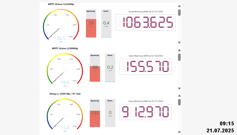 Výkon jednotlivých stringů on-line : Victron MPPT-1 / Victron MPPT-2 / Victron MPPT-3 / Victron MPPT-4