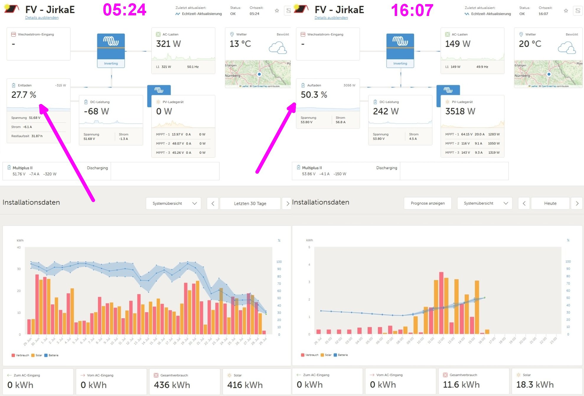 Dnes je to jako na houpačce ale alespoň trochu víc svítí - teoreticky tam je dnes o 7kWh víc a SOC je o 25% nahoře ? To je divný číslo....