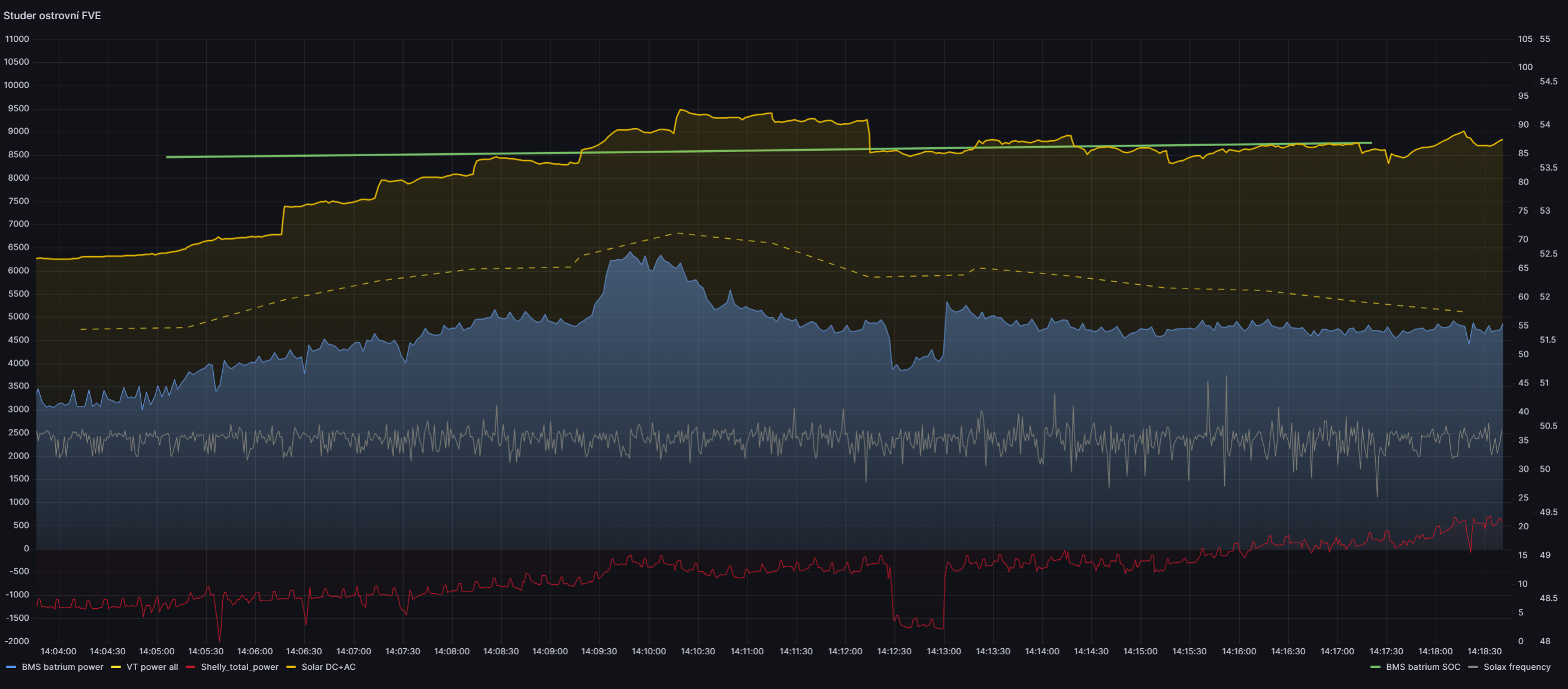 nemáš náhodou záznam frekvence? Alespoň se vzorkováním hustším než 1sec? Já teď jedu mikrosíť se Studerem a Solaxem a překvapuje mě dost stabilní napětí, ale docela kolísavá frekvence. Sice je tvoje a moje sít různě velká, ale je otázka, jestli to je věc principu řízení stability sítě, nebo prostě jen rozdíl výrobce od výrobce. Uvedený graf frekvence není v regulačním rozsahu, rozkmit se trochu liší podle spotřebičů. Frekvenci vyčítám ze Solaxu, ale myslím, že to takhle generuje Studer.