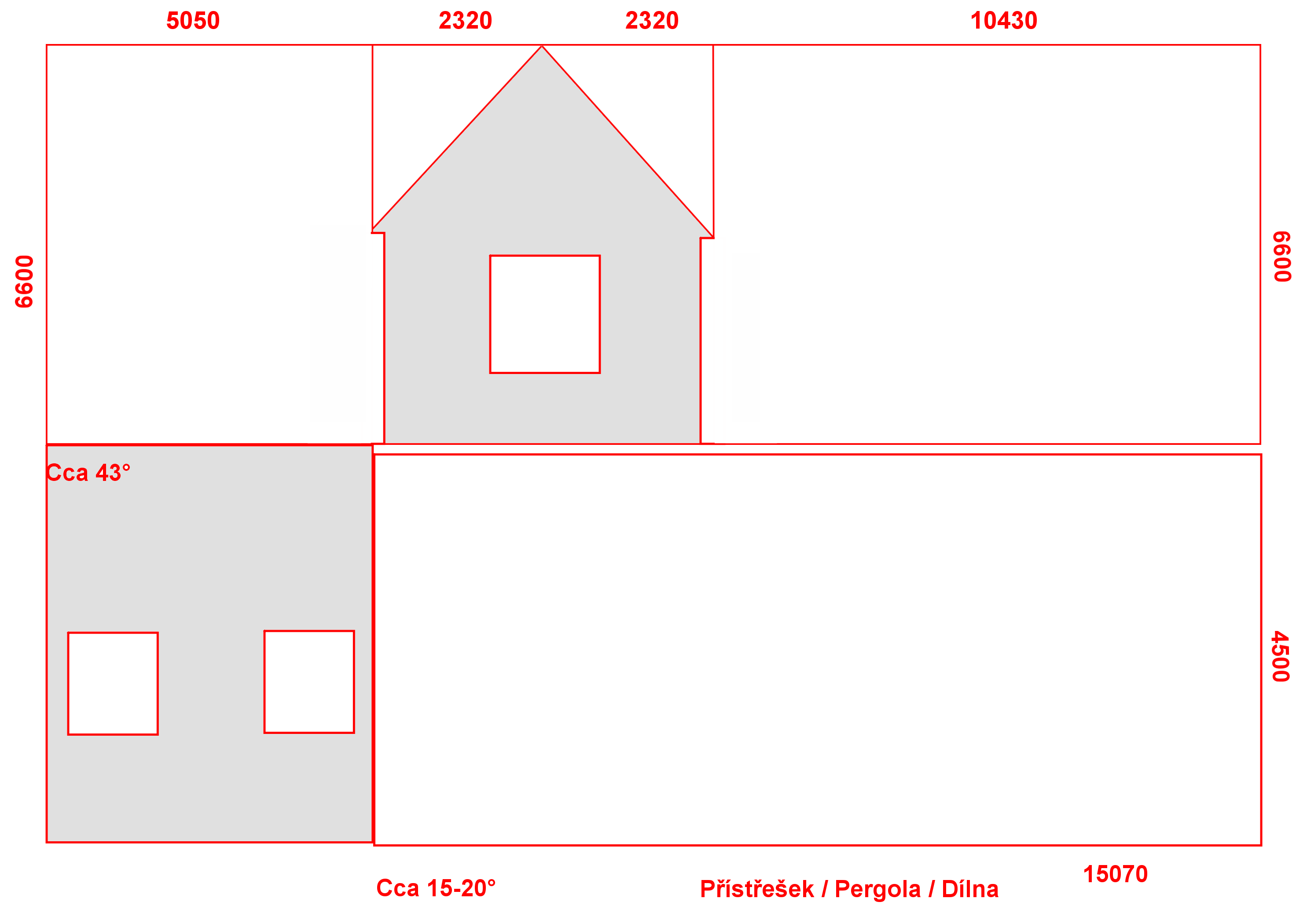 Sorry, ten obrázek nedávám. To je vše pohled zhora? Můžeš žlutě vybarvit, co je plocha střech, kam se můžou dát panely? Kromě kót vepiš i sklon střechy, směr sklonu a doplň šipku jih. Zlatej p. Šárek, učitel technického kreslení ze střední, všechny nás srovnal do latě, tohle bychom si nedovolili.
