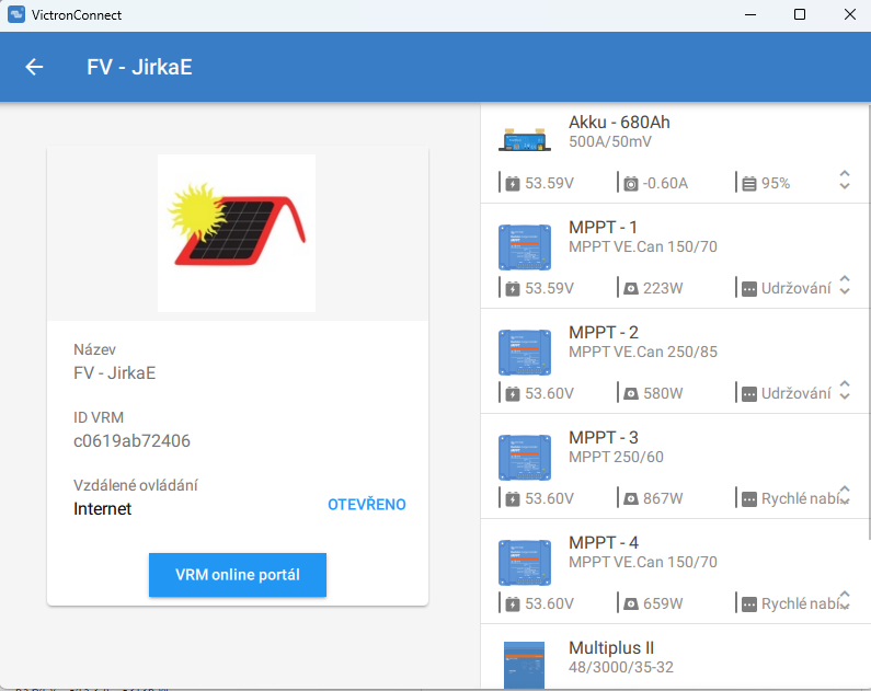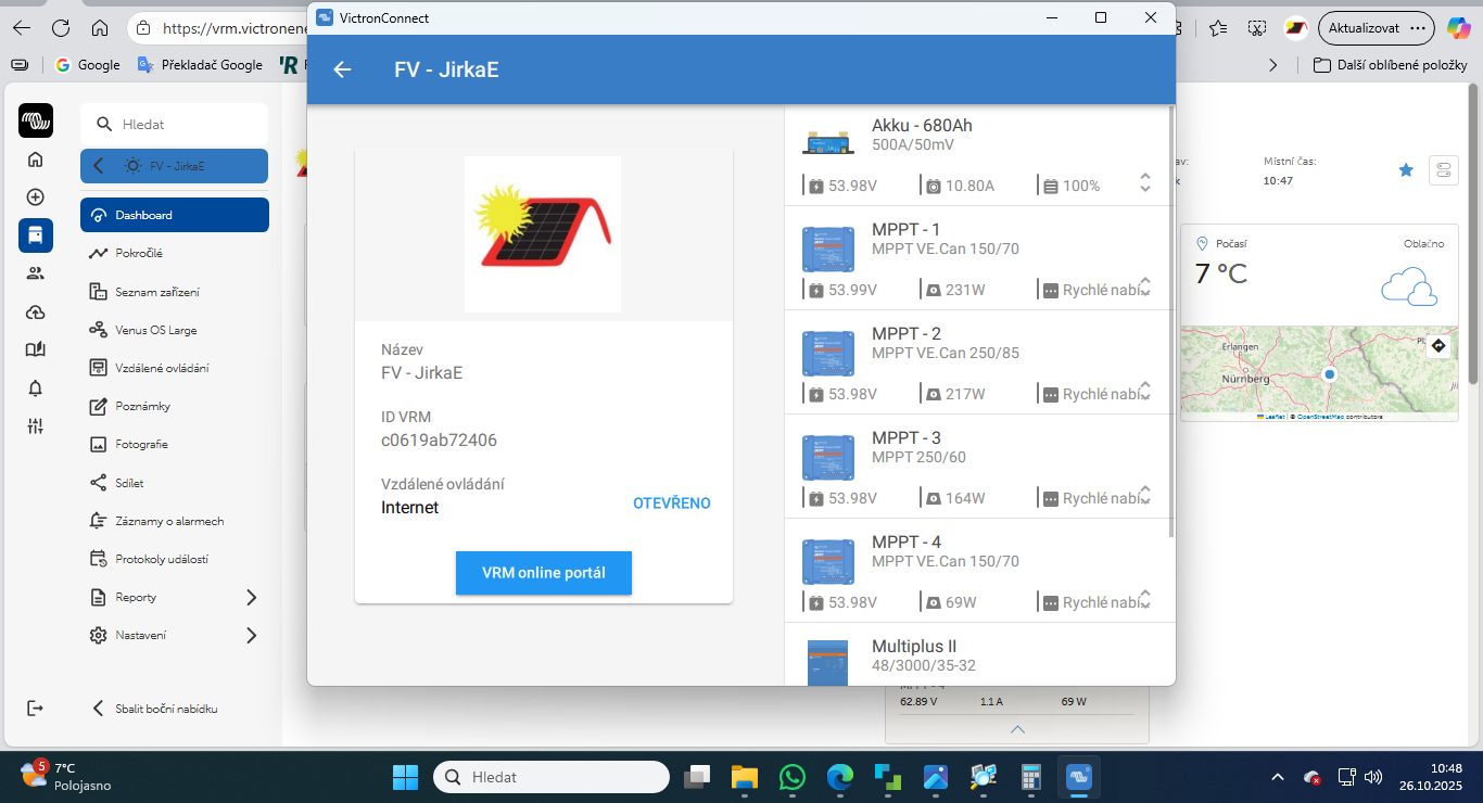 Ještě jednou jsem otevřel VictronConnect vzdáleně na PC a regulátor tam je zpět i bez zásahu