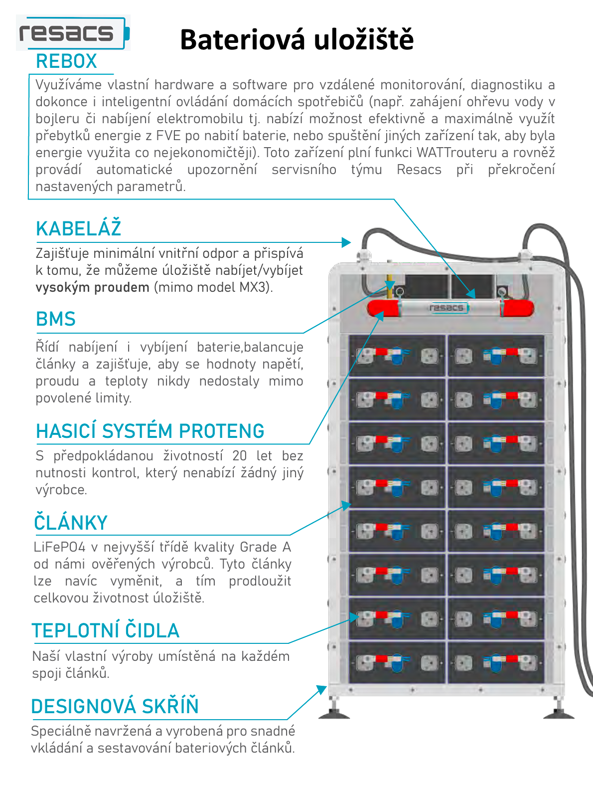 Dvě teplotní čidla na jeden článek. Na každém propojovacím vývodu článku jedno čidlo. Níže je přiložen obrázek jak mají osazení teplotních čidel řešeno u RESACSu na jimi vyráběných bateriových uložištích. Vyrábějí si svoje vlastní teplotní čidla a umisťují jedno na každý propojovací vývod článku.