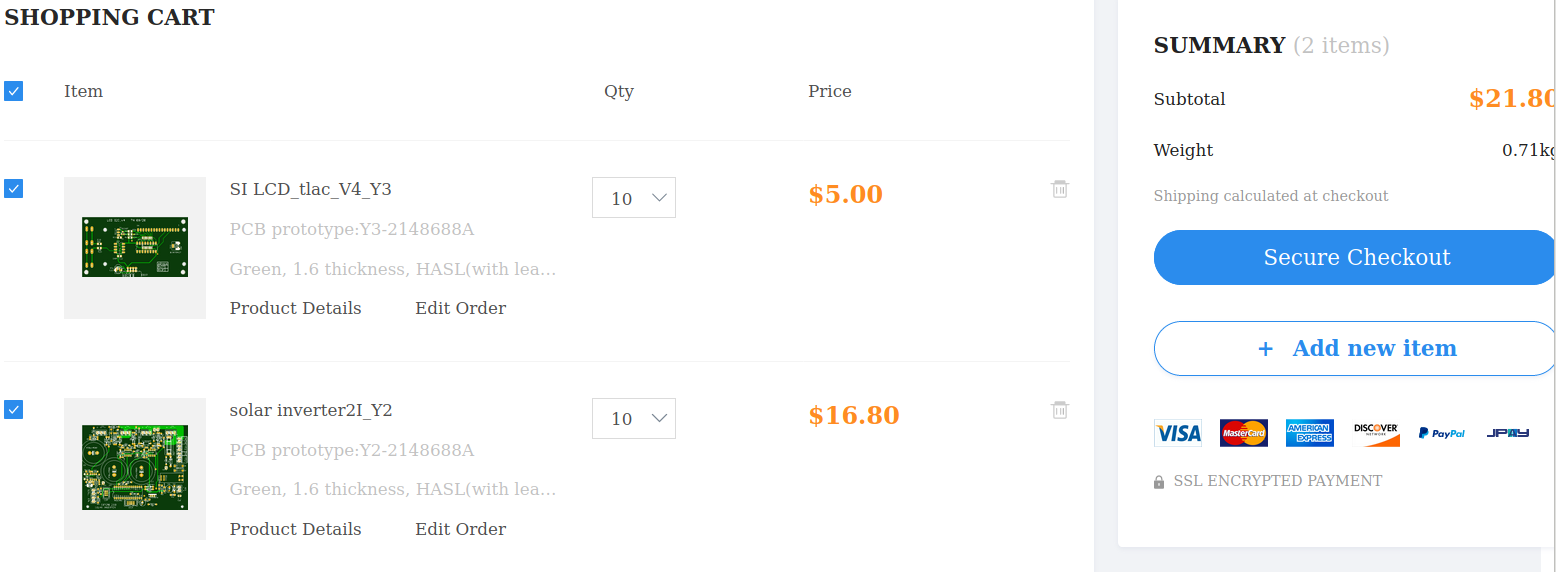 tak mě to nedalo a zkusil jsem to na jlcpcb.com a taky displej+board po 10-ti kusech a asi dělám teda něco blbě protože mi to včetně poštovnýho píše 19 dolarů za všechno, a to mi u tý desky tam pořád vybíhá nějakej připosraný "engeniering fee" za 3 dolary a nejde to vypnout.
