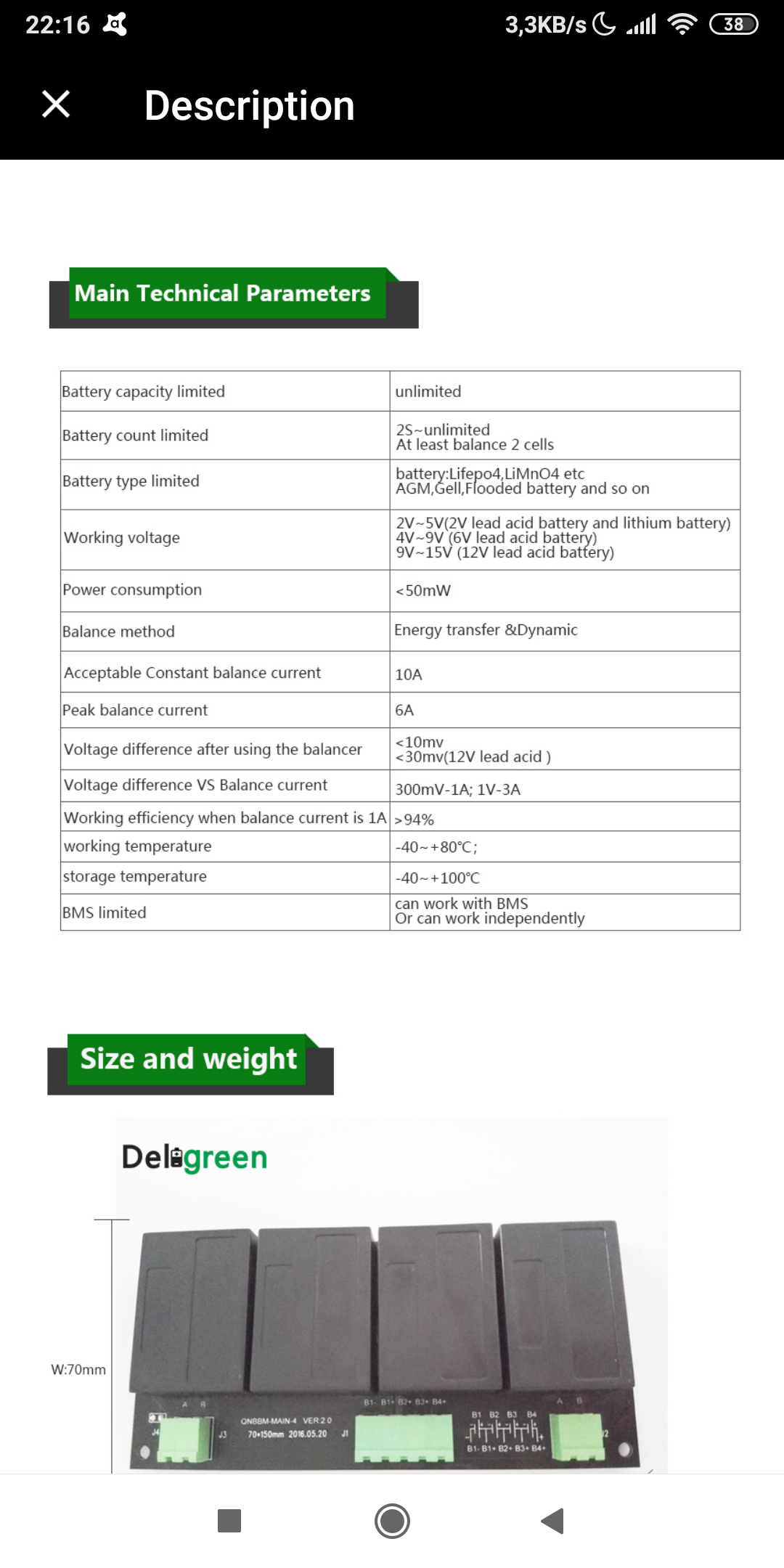 Mám to na stole taky ale v provedení 16s. Hodlám to nasadit na 240 Ah LiFePO. Je mi jasné, že velké odchylky to nebude schopné okamžitě srovnat. Očekávám vyrovnávací proud maximálně 1A. Při té nákupní ceně, která aktuálně platí, by ale nebyl problém nainstalovat dva nebo čtyři kusy paralelně. Oproti paličům, které fungují jen po krátkou dobu vyrovnávacího nabíjení funguje tohle pořád a tak by to mohlo zachránit zejména jarní restart fotovoltaické sezóny po dlouhém zimním půstu a taky dlouhá temná období, kdy se baterky nedostanou ani do absorpce a potloukají se někde kolem 20% SOC.marsal64 píše:Ježkovy oči, tohle nic (https://www.aliexpress.com/item/33033967951.html) že mám připojit ke svým milým drahým LiFePo a ne třeba poctivé drahé krabičky od Mandy a spol.?