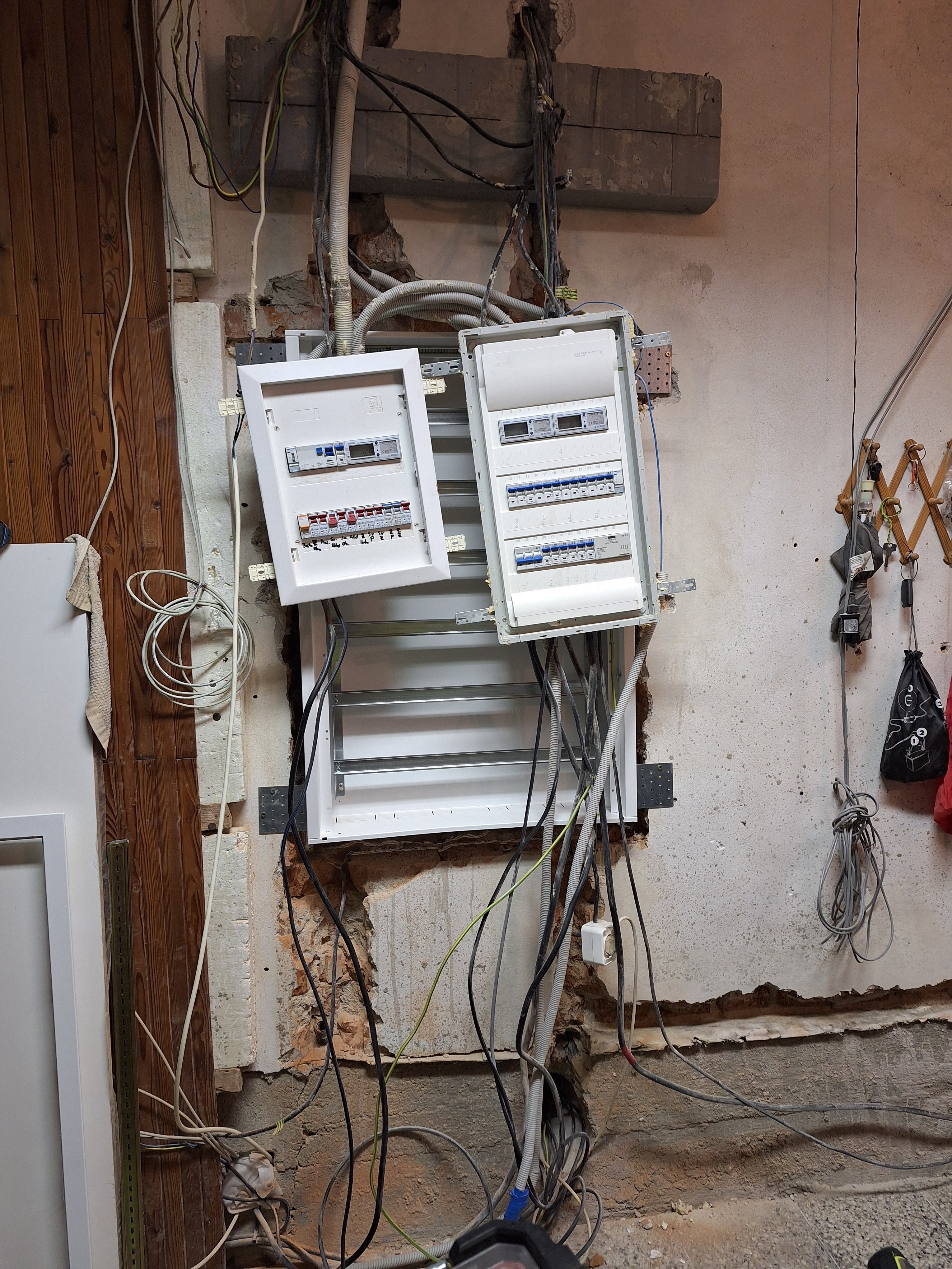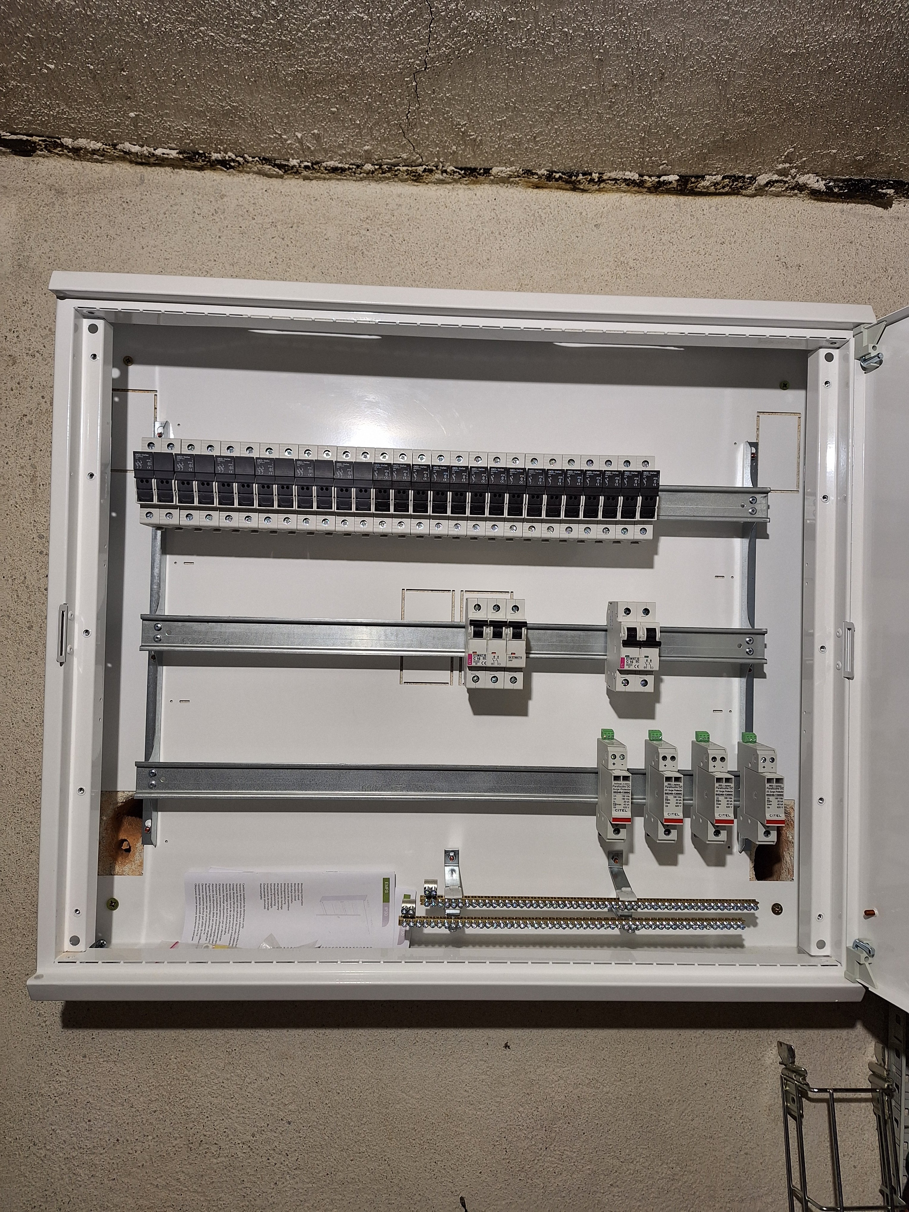 Mam vyhodu v tom, ze je tam dotahany jen jeden byt, zbyle tri maji svuj vlastni rozvadec + dilna, takze tady budou k nim akorat 3f jistice s elektromerama. No a na privodu 2x egd a nekolik menicu, pres total/central stop. Prepetovky zde jen na egd, ostatni budou primo u menicu ve sklepe.