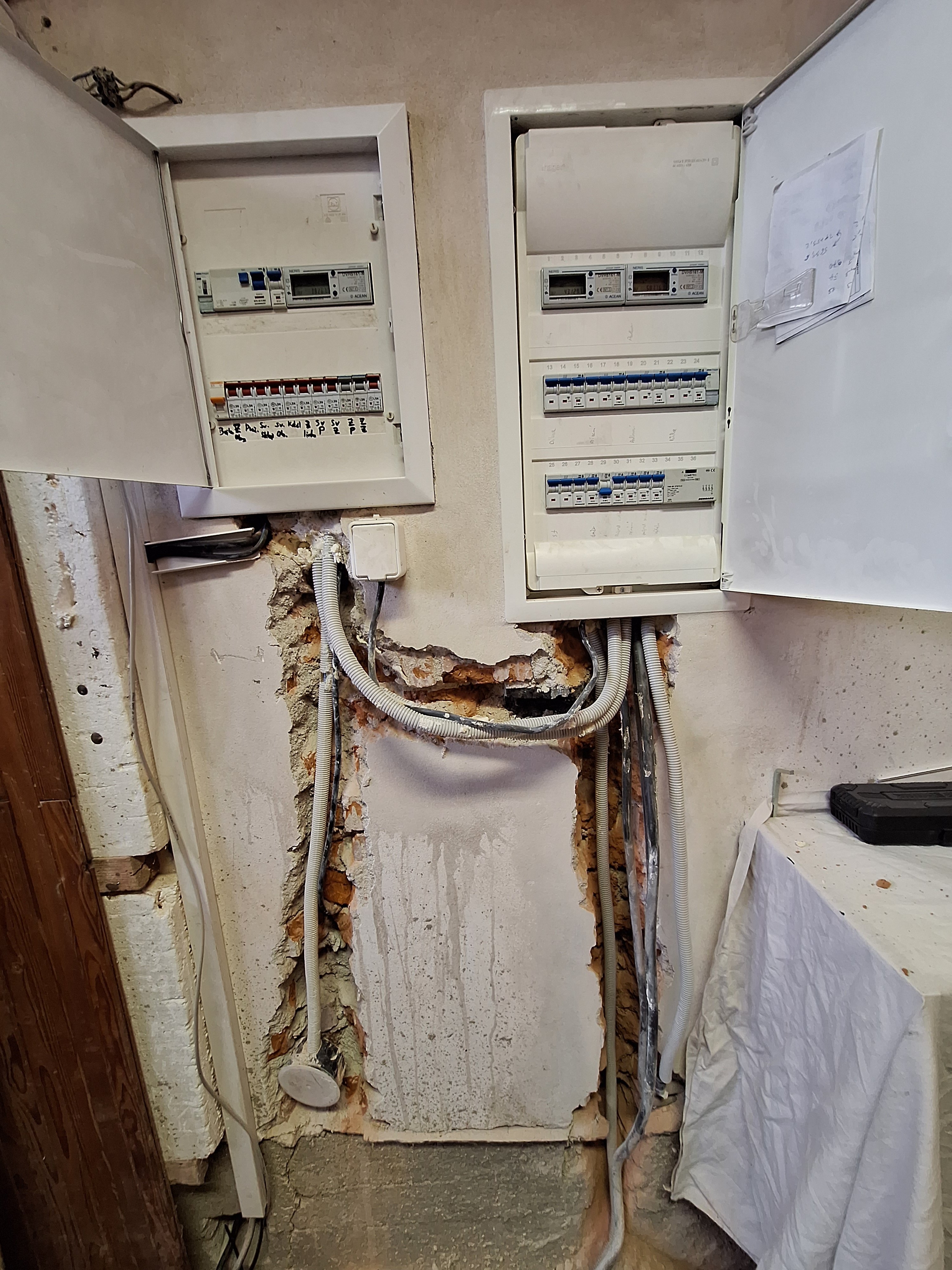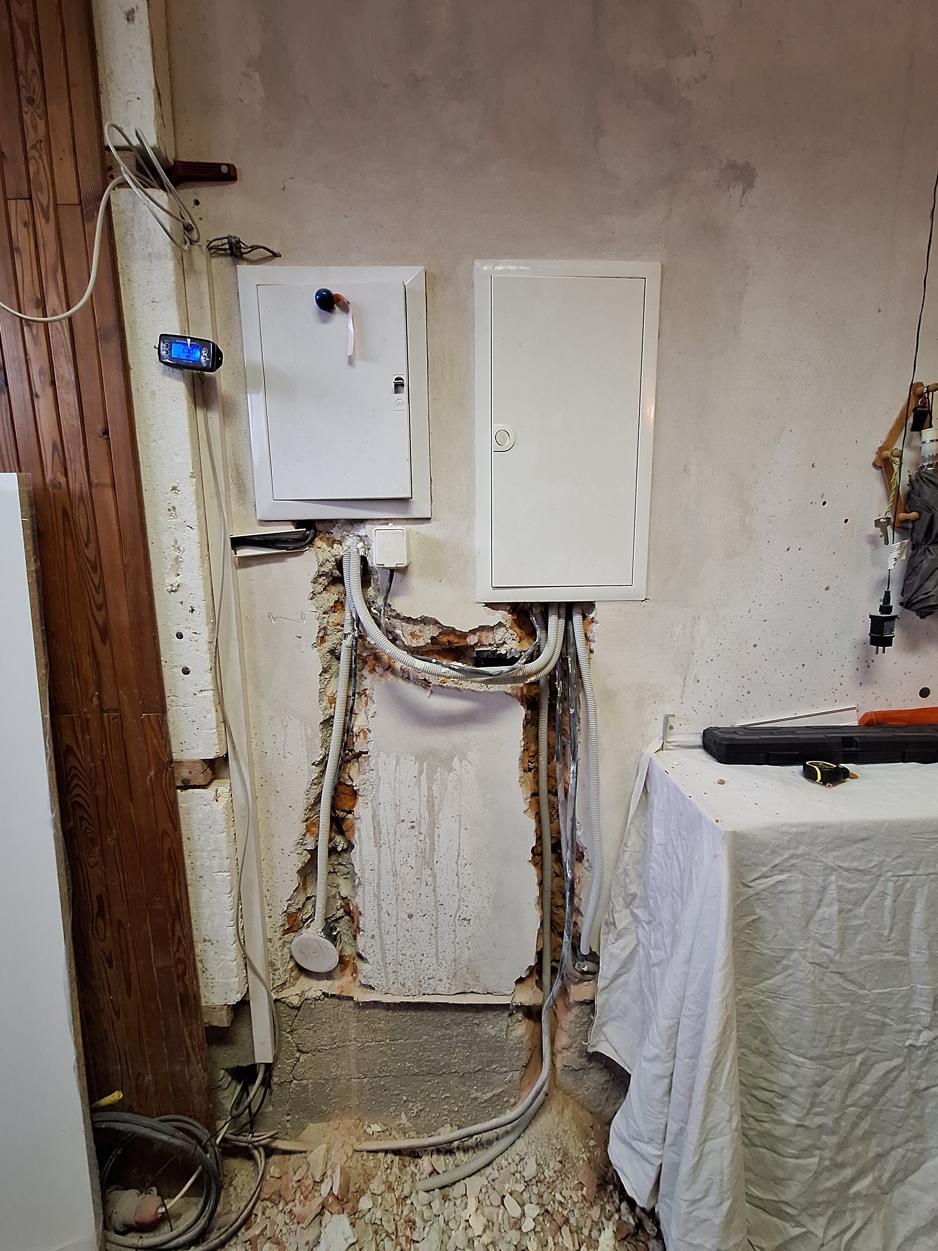 Dole je v plánu ukončit přívody z DS (2x), dát přepěťovky na každý přívod a připojit pořádné zemnění. U toho mě revizák odrazoval, že to nemám nechat ve sklepě, kde to je aktuálně (ta vysekaná krabice vlevo dole, z ní jde kabel do sklepa na svorku, co je asi zamlácená tyč v mokrém jílu pod betonem.