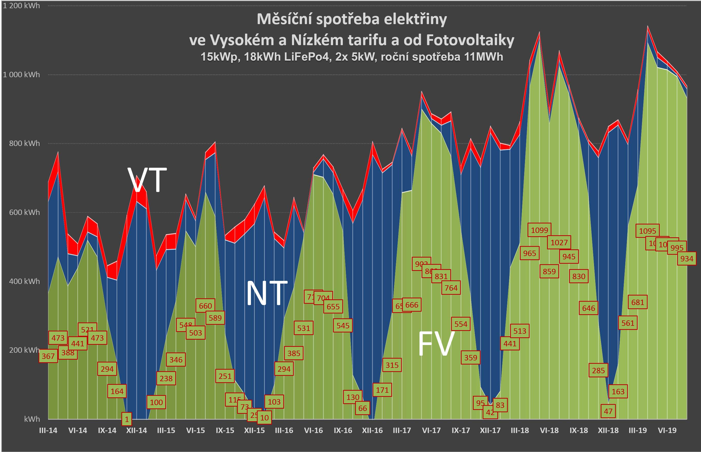 Chybí tam ještě další etapy, protože pokud někdo nejezdí (létání je jako škodlivé zakázáno) přes zimu za teplem, tak ostrov znamená stovky kWp na střeše. Spotřebu mám podobnou a postupný vývoj k současnému stavu vypadá takto:
