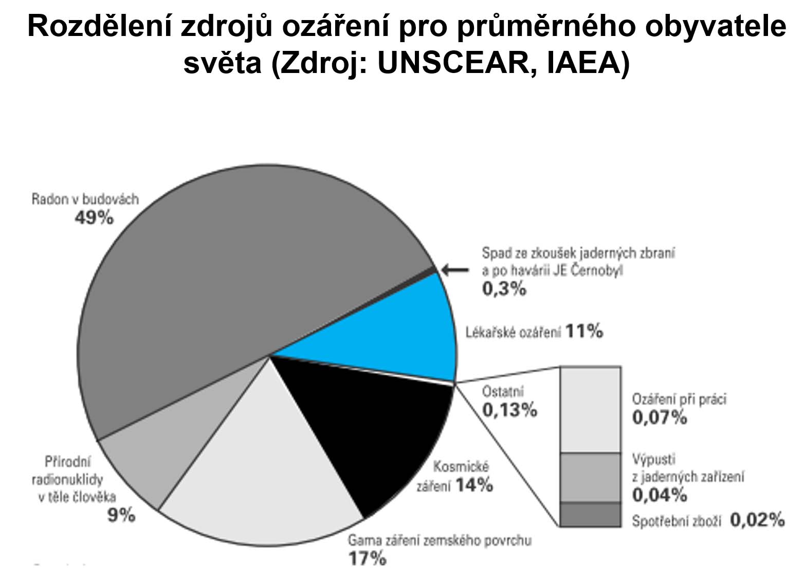 Jak je obvyklé, tak i v případě výroby elektřiny vybíráme z variant, které jsou k dispozici a která každá má některé nevýhody. Radioktivita z uhelných elektráren, z umělých hnojiv a podobně je vyšší, než ta, které se uvolní z jaderky. Není to tak dávno, co se celkem hojně prováděly pokusné jaderné výbuchy v atmosféře. A dnes v Česku umělé zdroje radioaktivity nedosahují 20% dávky, kterou dostáváme od přírodního pozadí. Přitom jsou oblasti na Zemi, kde je přirozené pozadí násobně vyšší než u nás a nepokládá se to za závadné. Pro srovnání, jakou katastrofu z hlediska ozáření představuje jádro se stačí podívat na obrázek. Jen takový draslík, který přijímáme v potravě, je zdrojem 20% ozáření.