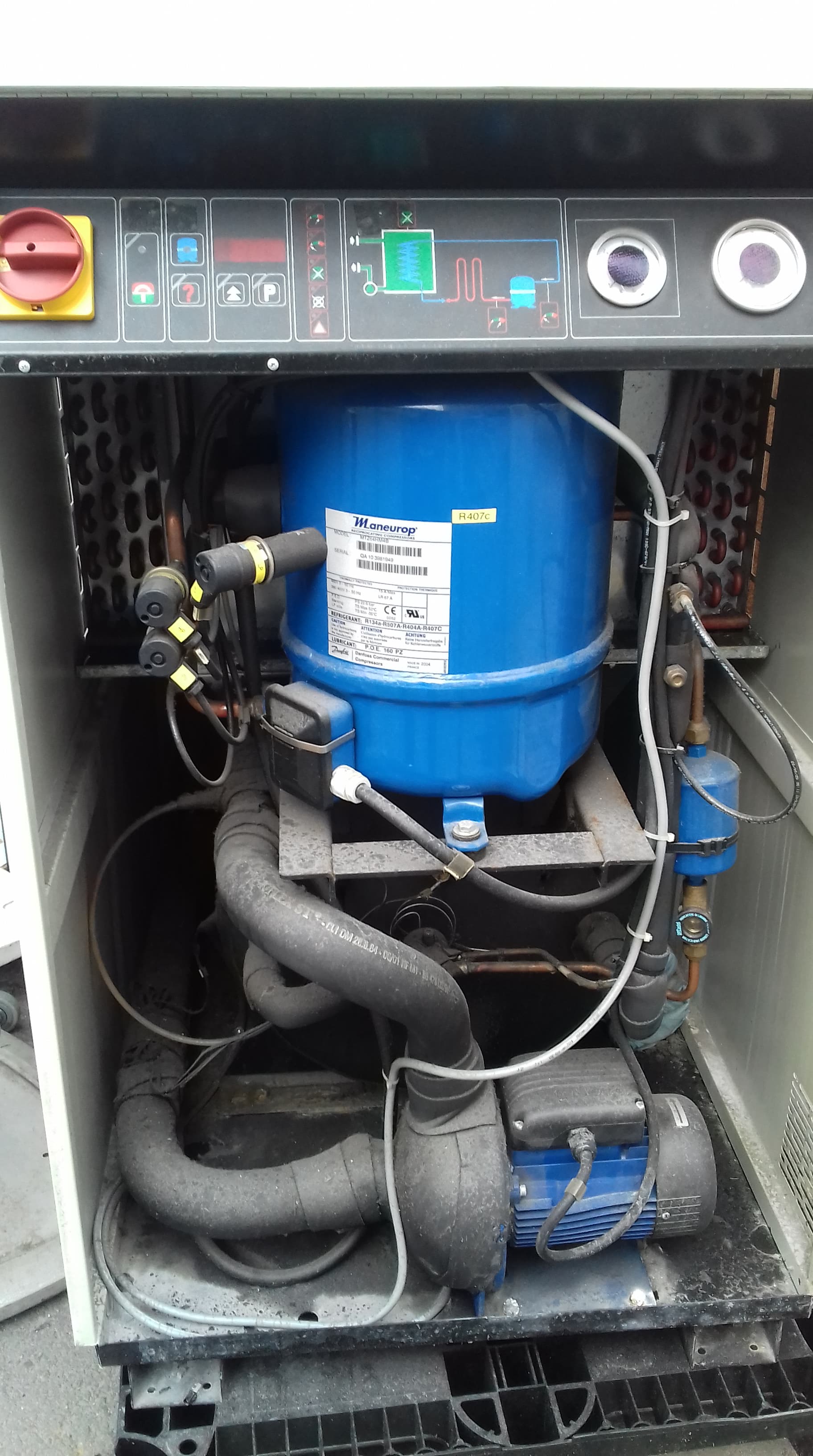Hlavní je kompresor, výměník se dá vyměnit. R410 na štítku a na kompresoru R407? Co je v tom asi doopravdy? Příkon 10kW. tj 40kW v teple. celkem síla. Frekvenčák v tom asi není, že?