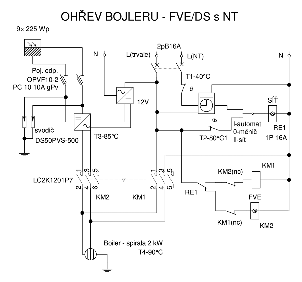 Ve schématu mě chybí jistič s vyrážecí cívkou ovládaný havarijním termostatem . Z praxe znám , případy kdy aku. nádrž se přehrála ( připečený stykač) a následně byl dům "vyčištěn" přehřátou párou .
