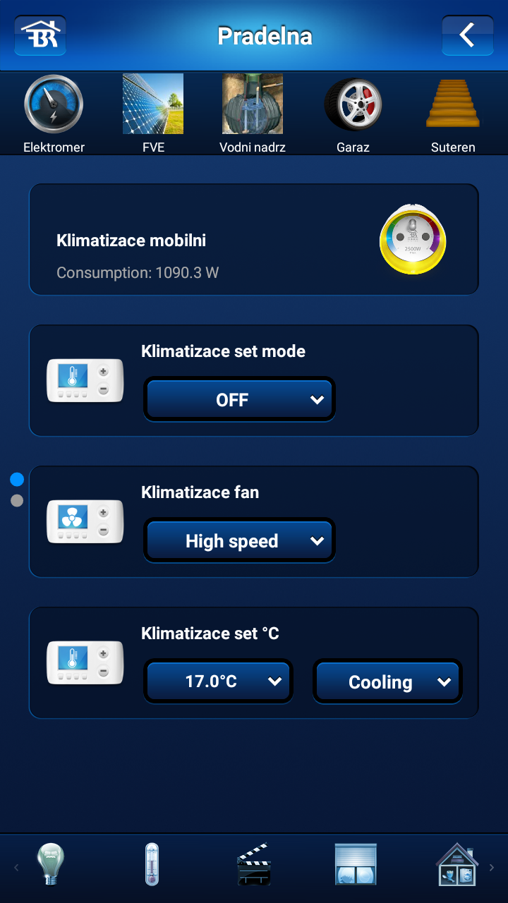 Sušička se nyní zobrazuje v rozhraní Fibaro a umožňuje nastavit režim, cílovou teplotu, rychlost větráku. Samozřejmě je možné sušičku na dálku také úplně vypnout/zapnout. Přístroj je zapojen do měřené zásuvky, takže k dispozici jsou také údaje o historické i realtime spotřebě energie.