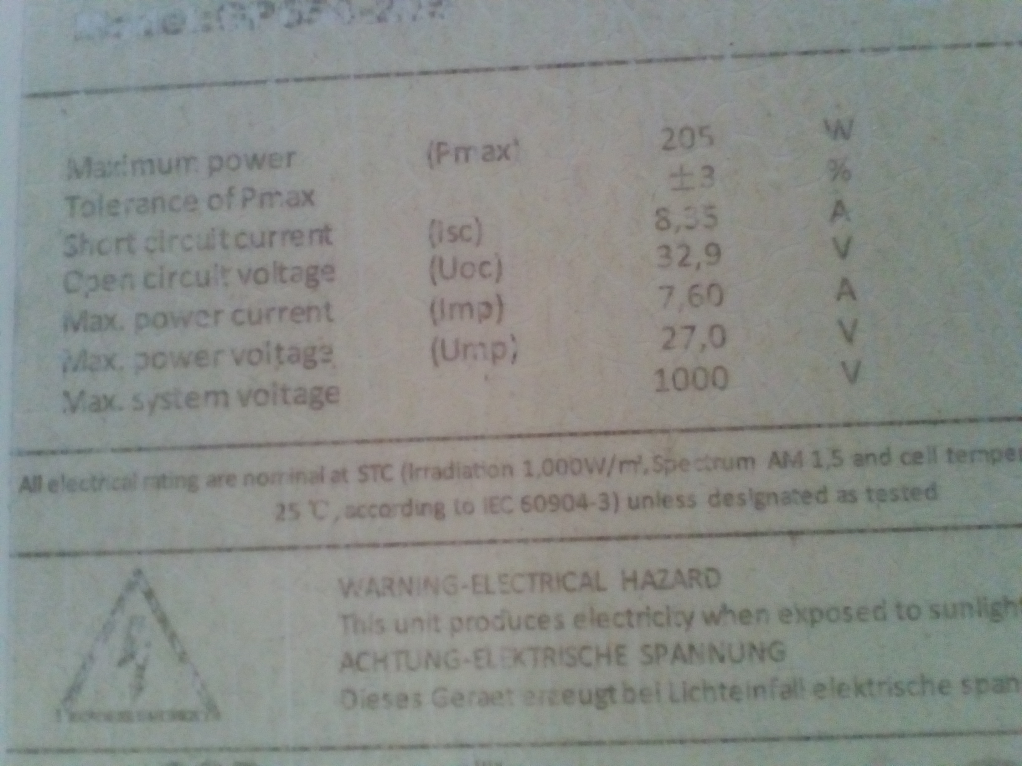 Ump je rovných 27,0 V pri STC, v reálnych podmienkach bližších k NOCT má panel maximum niekde medzi 24,5 - 25 V a pri slabých osvitoch ešte nižšie. Znamená to pre väčšinu batérií, že treba buď použiť dva panely v sérii a mppt regulátor, alebo použiť batériu s najčastejším pracovným napätím okolo 24,5 V. Tu je dosť slabý výber ....