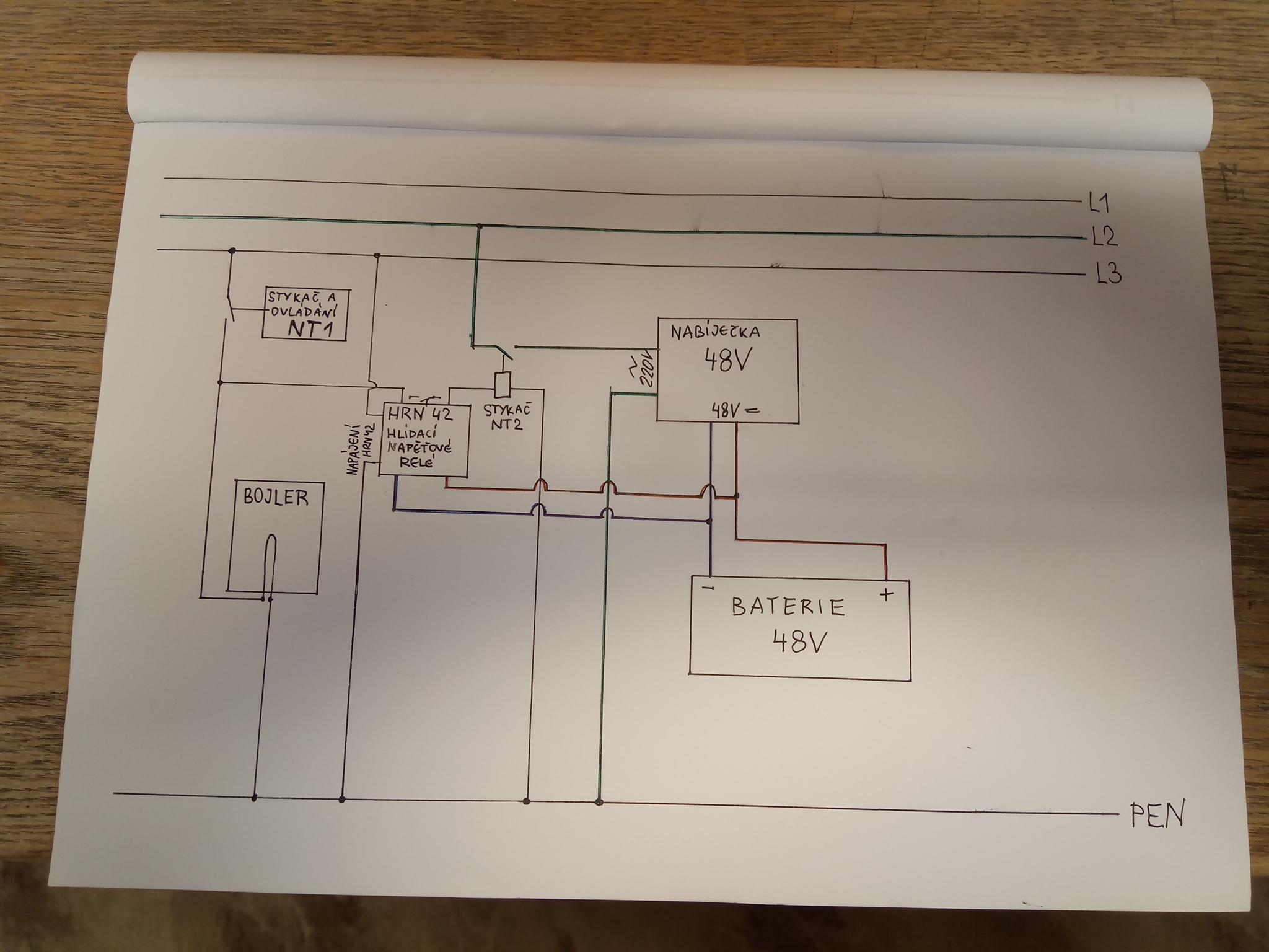 Na přívod ee k bojleru je připojeno hlídací napěťové relé HRN 42 a stykač NT 2 který spíná přívod k nabíječce 48V braný z jiné fáze.