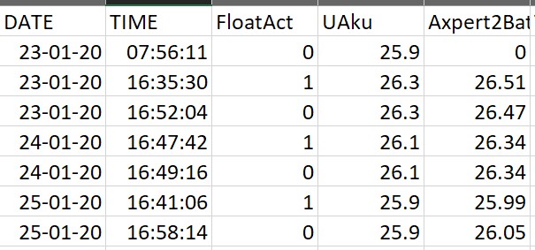 Takže: vytěžovač včera i dneska fungoval (resp. dnes nebylo u mne co vytěžovat, viz můj dnešní příspěvek v rubrice Počasí), ale brzy poté, co slunko přestalo cokoli dávat (16:35 včera a 16:47 dnes) Axpert šel do floatu při napětí hluboce pod 27.6V, setrval tam včera 17 minut, dnes 1.5 minuty a poté float opustil.