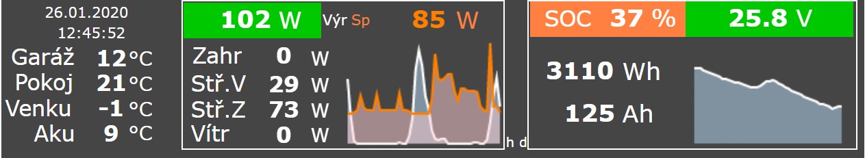 - v hraničních mizerijních podmínkách, jako jsou dneska, je MPPT (Stř.Z) prostě lepší než PWM (Stř.V). A takhle vypadá vývoj od idejí do praxe: mám dva Axperty, jeden z nich funguje už jen jako MPPT regulátor, uvažuji, že ten druhý (momentálně měnič + PWM) budu používat jen jako měnič a pro podobné situace jako dnes koupím ještě jeden MakeSkyBlue...