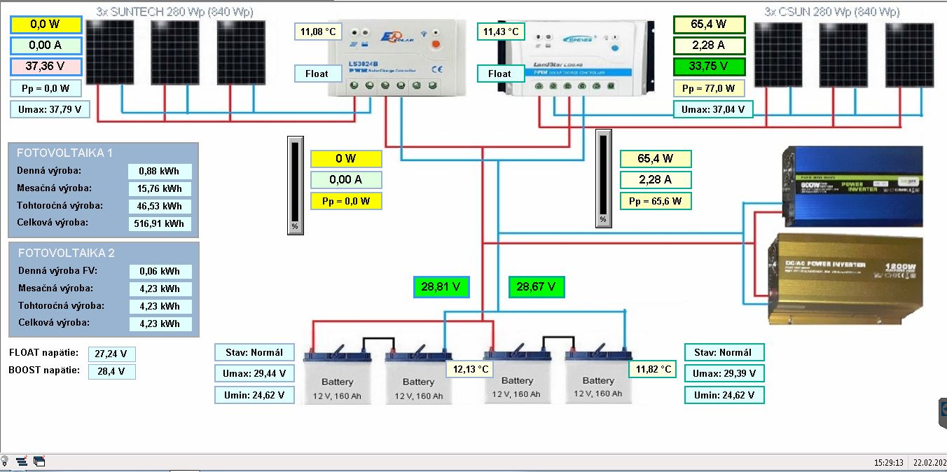 Keď tak pozerám na tú vizualizáciu tak oba regulátory vykazujú float ktorý je nastavený na 27,24v a napätia batérie vykazujú 28,81v A 28,67v. Takže nemôže to byť len tým, že obmedzil nabíjanie kvôli vysokému napätiu batérie. Nakoľko ten jeden ukazuje o 0,14v viac?