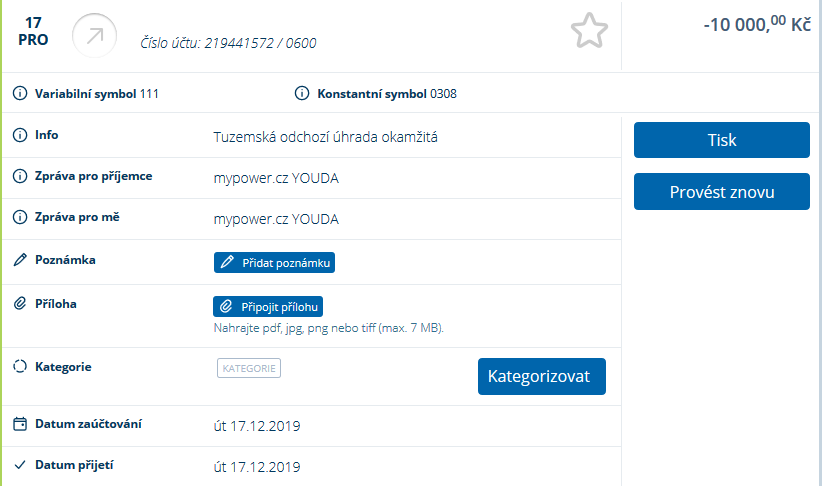 Právě jsem ti tedy odeslal slíbených 10 tis Kč. Snad za to koupíš něco pěkného pod stromeček a nenecháš si to jen pro sebe