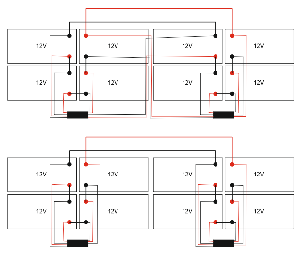 Nejjednodušší je zapojit balancér na 4+4 baterie, ale napadlo mě, jestli pak budou mít oba boxy shodné napětí? Nebylo by lepší balancování baterie zapojit jako 3+1 viz obrázek níže (zapojení nahoře)?
