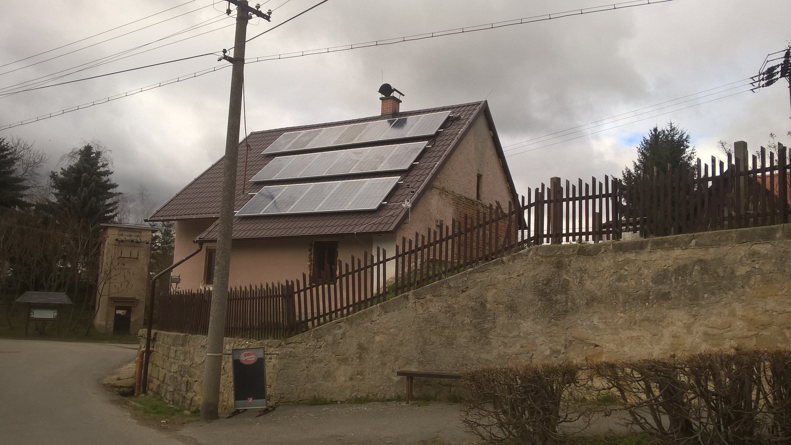 - přidání FV pole o 18ks bazarových FV panelů 235Wp (dřevník) Panely jsou použity jako střešní krytina.