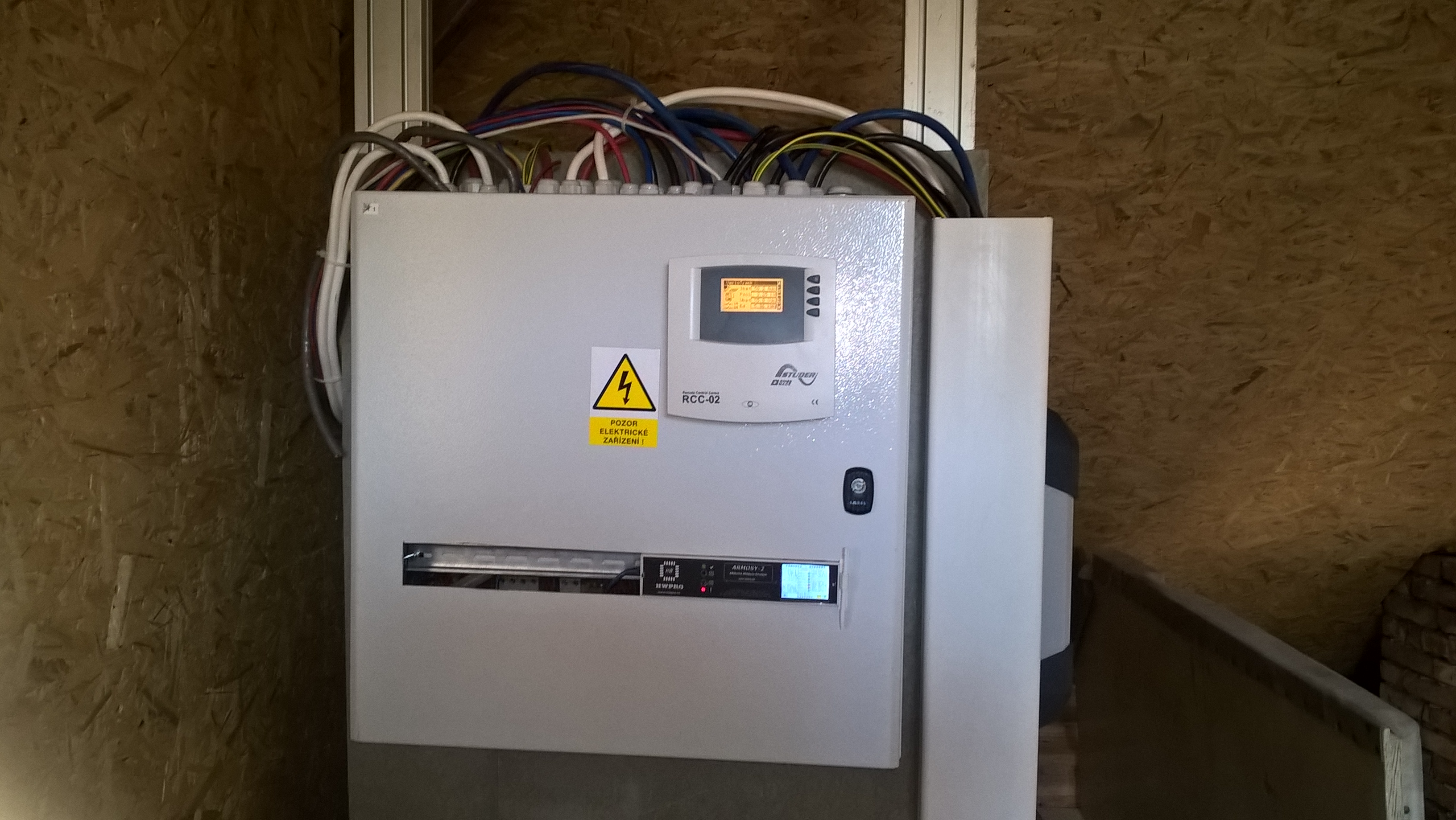24x Solární panel JINKO SOLAR 225 Pmpp=225W, 2x Regulátor STUDER VT-80, 2x Střídač Studer XTM 4000-48, BSP, RCC, 1x AKU 48V LFP200Ah 1x AKU 48 V LFP280Ah. Řizení a dohled, SDS, vlastní vyčítání arduinem DUE v krabičce (ARMOSY), export dat do RPi s databází a html stránkou.