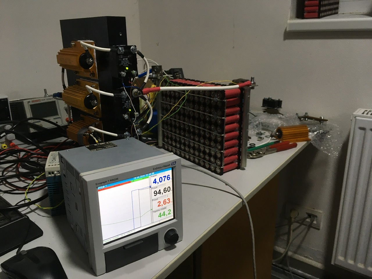Sestrojil jsem takovou jednoduchou umělou zátěž. Nedá se sice řídit, ale můžu vybíjet až 100A na začátku vybíjení a cca 70A na konci vybíjení. Dal jsem vybíjet první z hotových bloků, tak mě zajímá co z toho vyleze. Stejným způsobem chci proměřit i bloky co mám v elektrárně, abych měl tušení, jak se to za rok pohnulo.