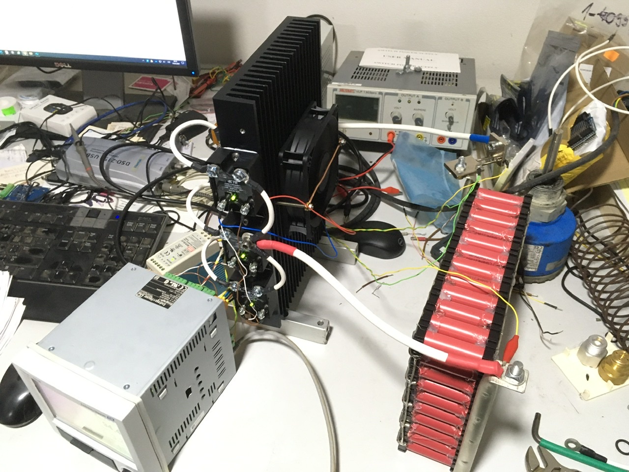 Dám sem pár fotek vybíječe. V podstatě se jedná vždy o odpor 0,1Ohm a SSR, které ho připíná. Celé je to 3x paralelně, asi by šlo i 4x, ale nějak jsem měl pocit, že to už ten chladič nevyzáří. Teď z toho dokážu tahat cca 390W na začátku vybíjení.