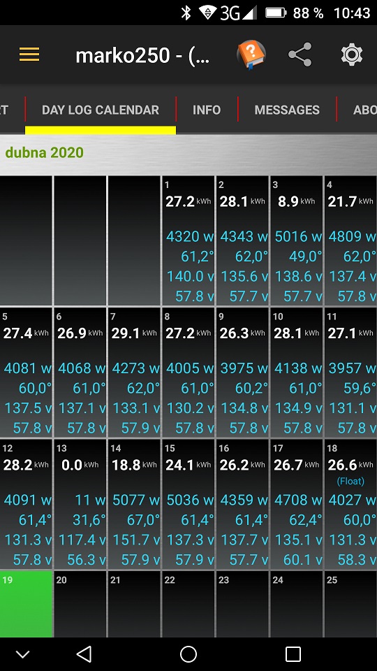 JZ střecha(20ks/230Wp) dala teď v březnu maximálku ve výkonu 5112W a napětí 153.5V.Na MakeskyBlue a JV fasádě(12ks/225Wp) jsem viděl v 10:00hod 2620W.Nyní mám v těch deset hodin dopoledne baterku vždy na 100% SOC po noci a to jsme všichni doma už pomalu měsíc.Nyní spálíme běžně přez 40kWh,včera 47kWh z obou polí za den,přez noc je ještě zima ,tak se dotápí i kotlem na dřevoplyn.