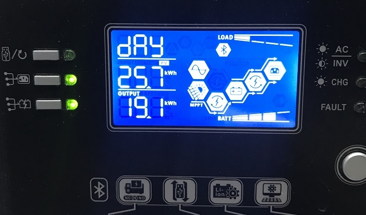 Labák v skúšobnej prevádzke. Na streche 12x285Wp Amerisolar + 18x235Wp repasovaných LDK + na garáži 6x235Wp repasovaných LDK. Celkom 9060 Wp. Pripojené sú momentálne PIP1-3S4P Amerisolary, PIP2- 3S5P LDK, MSB1- 3S1P strecha, MSB2- 3S2P Garáž., 2x PIP5048MK paralelne, , 2xMakeSkyBlue 60A . Aku Li-ion 18650 Skladačka 60P14S + 6x LG 28P7S bloky = 21kWh využívaných cca 16 kWh, 4x ANT BMS 320A. Sledovanie zatiaľ staré miniPC s Watchpowerom.