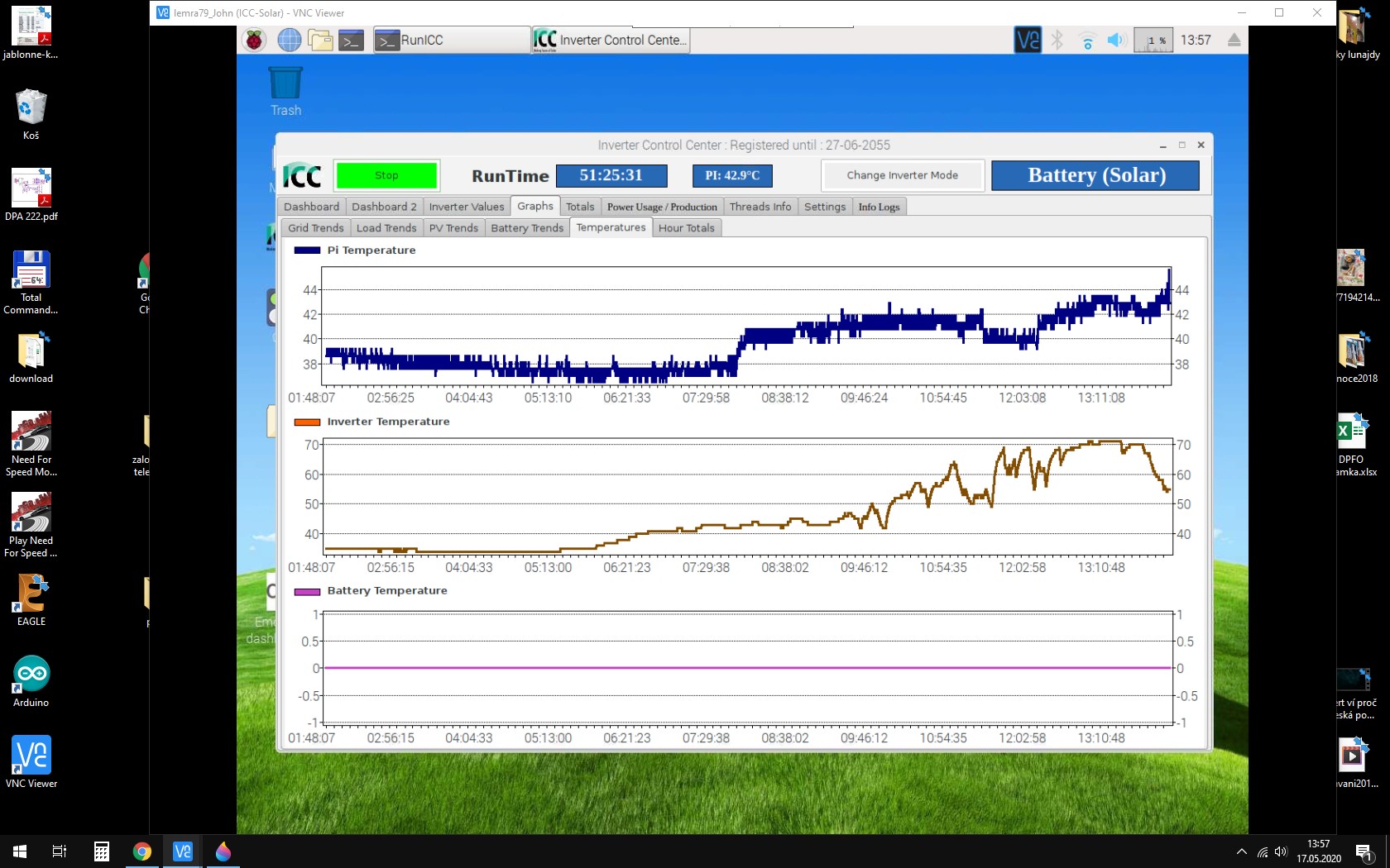 Ahoj to mi přijde hrozně moc, zatím zasílám foto z VNC, okolí má 17 stupnů ve stodole, a měniče jedou na 70 procent. cca 7,5 kW z 10 kW.