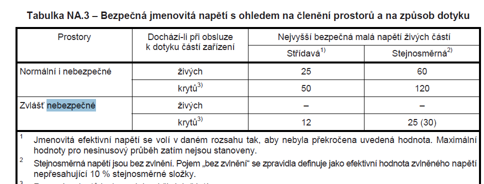 změnilo, tabulka je z normy platné do roku 2000... V současnosti platná ČSN 33 2000-4-41/ed.3 už nikde nemá zařazení prostor, takže prostory normální, nebezpečné a zvlášť nebezpečné už neexistují. A nebo je to v jiné normě...