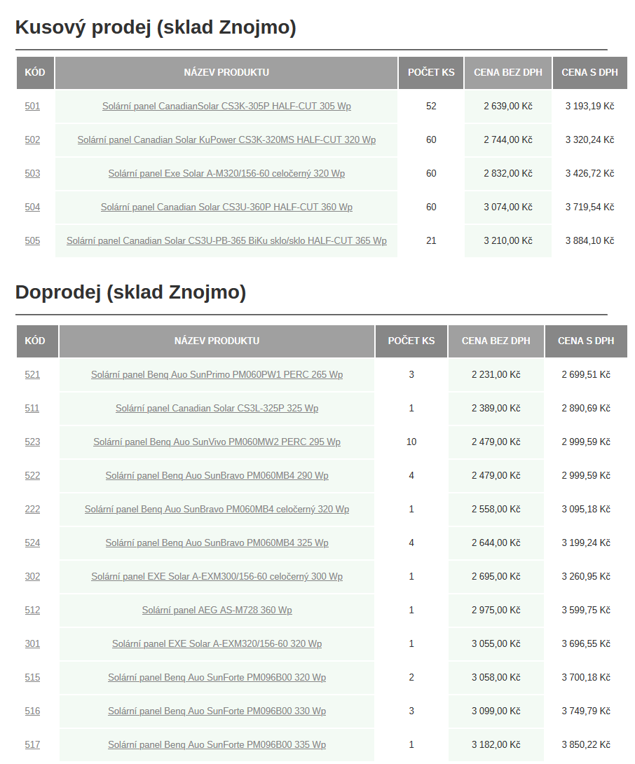 Zdravím, opět po nějaké době nabídka skladových zásob ve Znojmě. Odběr možný po domluvě prakticky kdykoli. Větší množství samozřejmě také není problém, ale při pohledu do dodavatelského ceníku zde už nic nejde pod 300 Wp.
