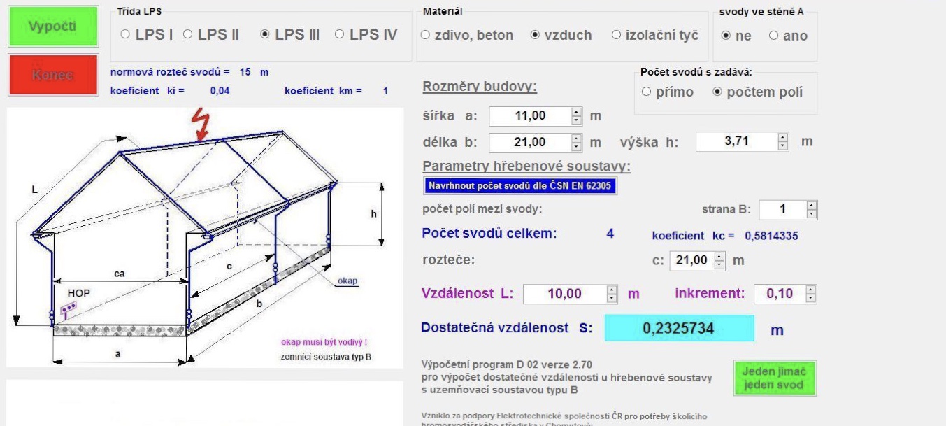 Tak hromosvodář mi poslal 2 výpočty "S" vzdálenosti pro mojí střechu. V jednom případě je výpočet pro svody každých 10 metrů, v druhém případě co 20 metrů (aby nebyla délka střechy rozpůlená hromosvodem).