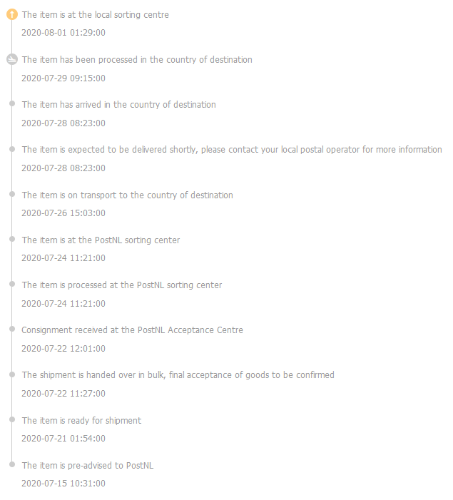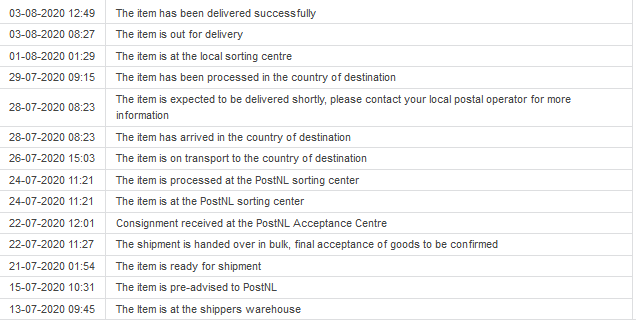 CN: co poskytuje aliexpress, NL: co poskytuje to Track&Trace PostNL, CZ: co píše česká pošta (té se to objevilo v systému zpětně, až během asi posledních 4 dnů.