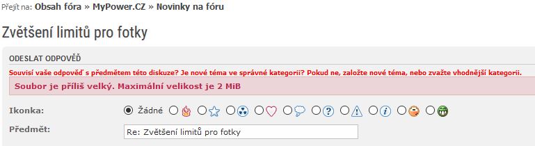 Krůtí brko, vypadá to, že se to rozbilo!mypower.cz píše:Ahoj, pokusně jsem zvětšil limity pro fotky na fóru.