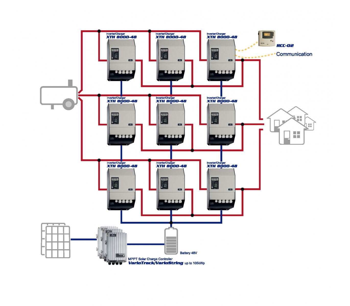 XTH a ani XTM nemaju solarny regulator, su to "len" menice s moznostou nabijania z DS. Ako solarny regulator sa pouzivaju VarioString VS 70, VS 120 (HV) alebo VarioTrack VT 65..., ale da sa pouzit aj od ineho vyrobcu (Victron), len komunikacia sa musi potom riesit inak.