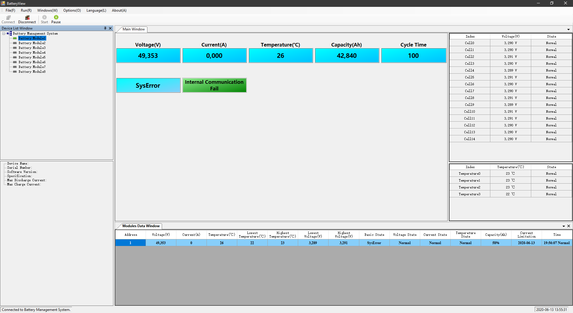 Když jsem na konci druhého týdny suterén uklízel, vidím, že pod igelitem na master cihle svítí červená kontrolka. Připojil jsem tedy diagnostiku, která mi oznámila, že master baterka ztratila komunikaci s ostatními cihlami, viz screenshot níže. Všechny cihly jsem tedy vypnul pomocí kolébkových vypínačů, pak znovu zapnul, a nakonec nastartoval i všechny měniče. Funkce byla normální.