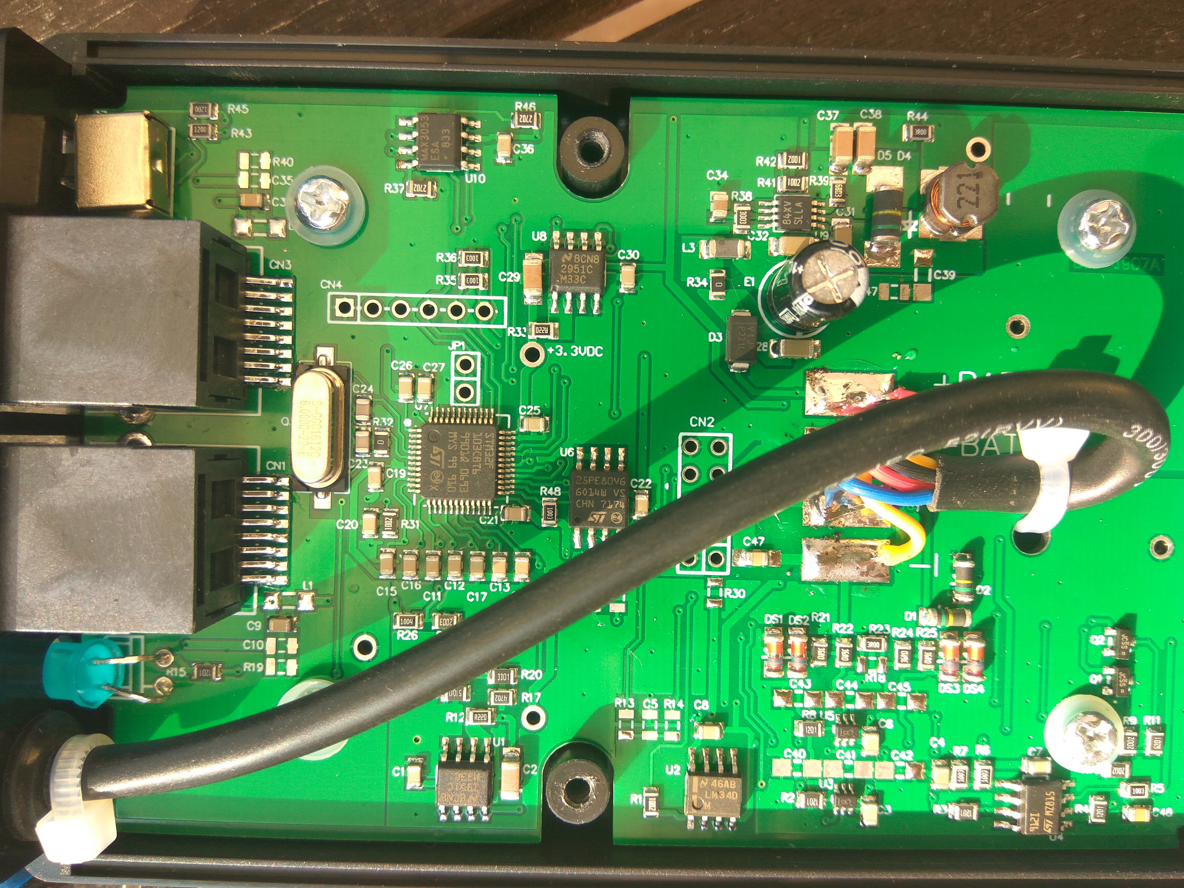 Co ma prekvapilo, ze tam nie je specializovany prevodnik, vyzera to tak ze napatie z bocnika (shunt) sa zosilnuje operacnym zosilovacom (v pravo dole) a potom sampluje 12 bitovym prevodnikom v STM procesore. Ci pouzivaju aj zmenu zosilnenia na zvysenie presnosti neviem, ale asi ano. Je tam aj extra pamat pre ukladanie udajov na pravo od procesora.