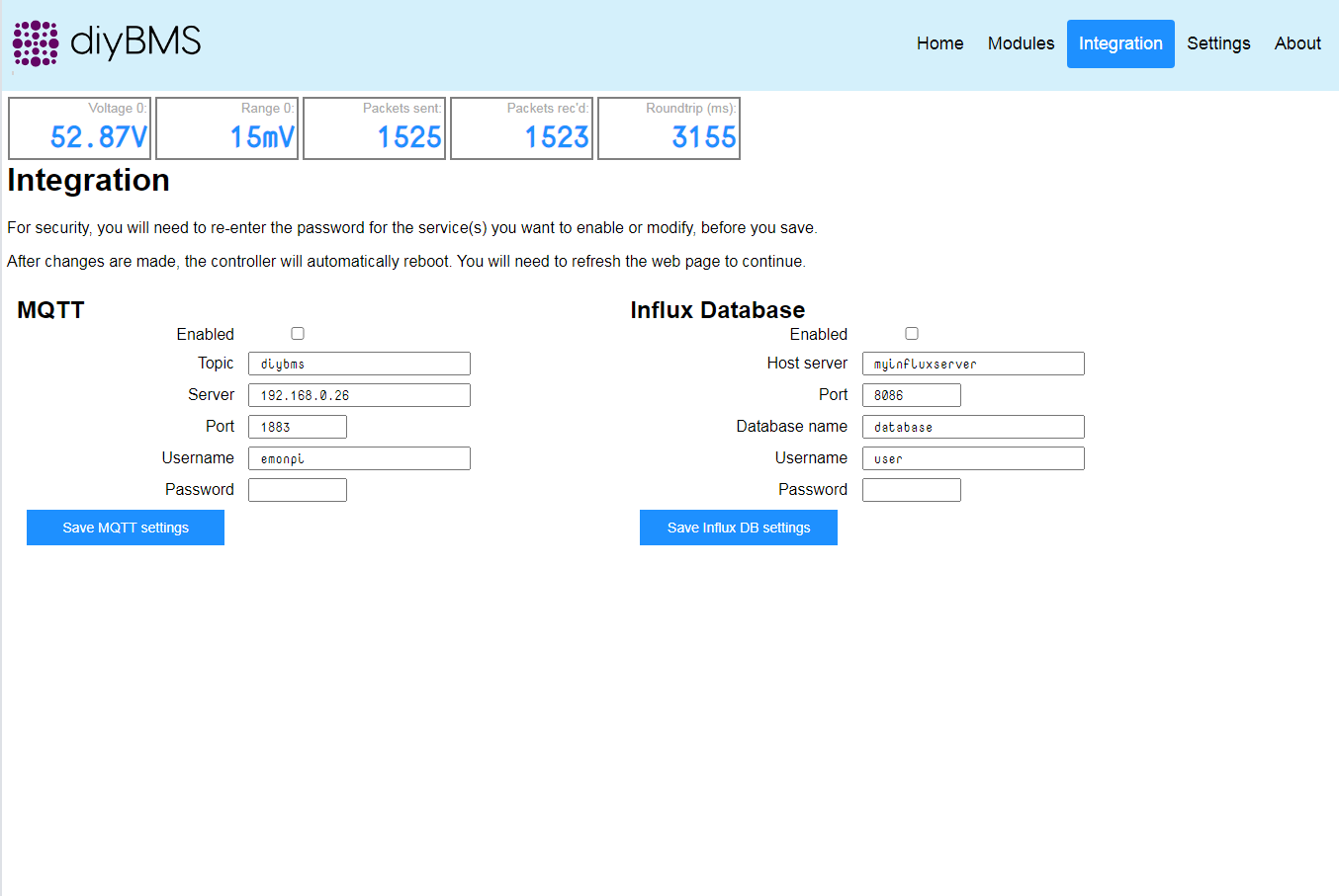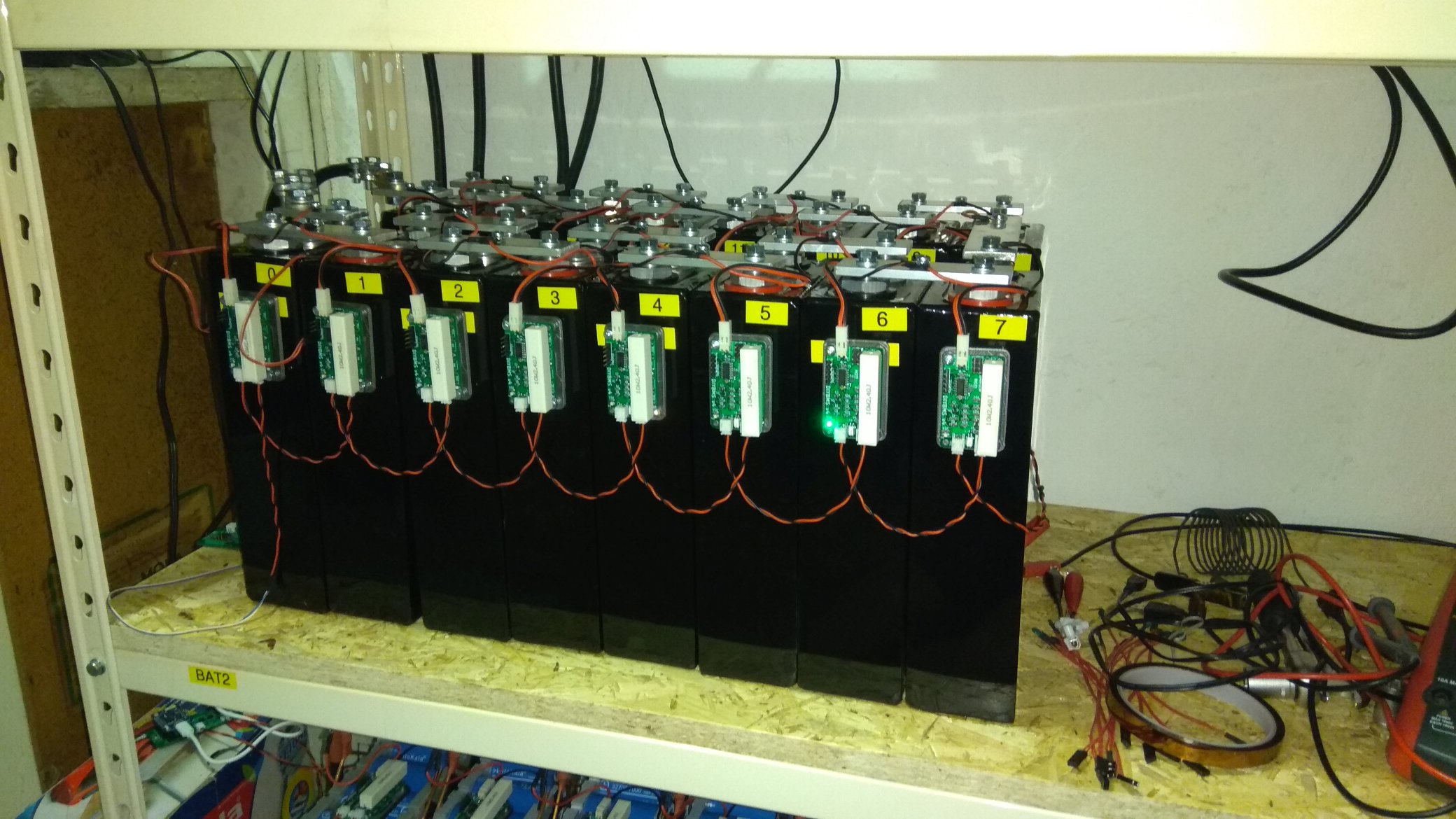 ještě pár informací k použité diyBMS v4, jako řídicí procesor je ESP8266, který komunikuje s jednotlivými moduly na článcích. Každý modul funguje samostatně, tak i když vypadne komunikace balancování je funkční. Řídicí modul má čtyři výstupy jejichž reakce se dá nastavit dle potřeby, já mám v plánu využít pro přepnutí měniče do režimu SUB v případě, že některý článek poklesne pod nastavenou úroveň, a úplné odpojení baterie při určitých hraničních stavech. BMS je dostupná přes sít po wifi. Měla by umět i MQTT nebo ukládaní do databáze (nevyzkoušeno).