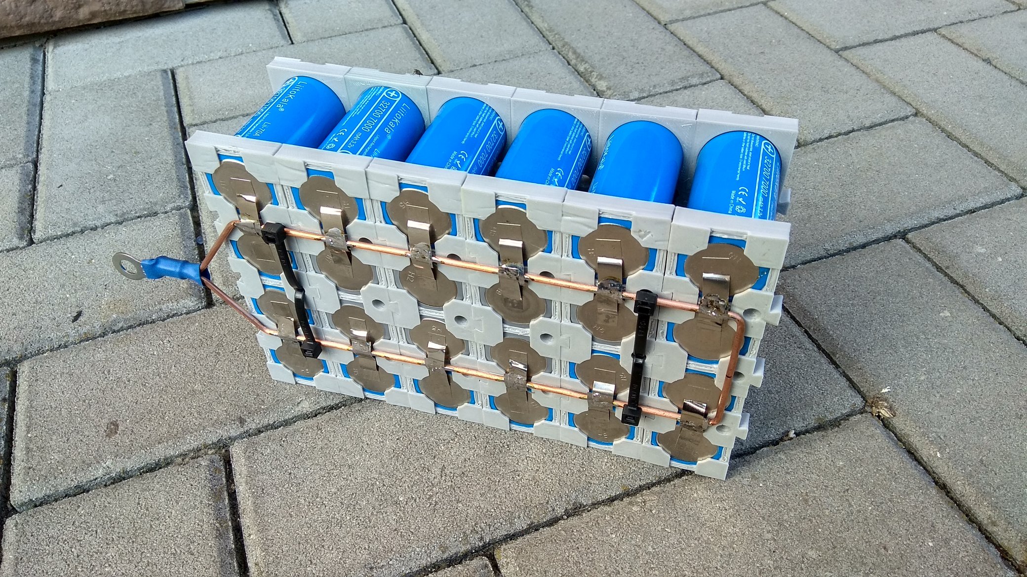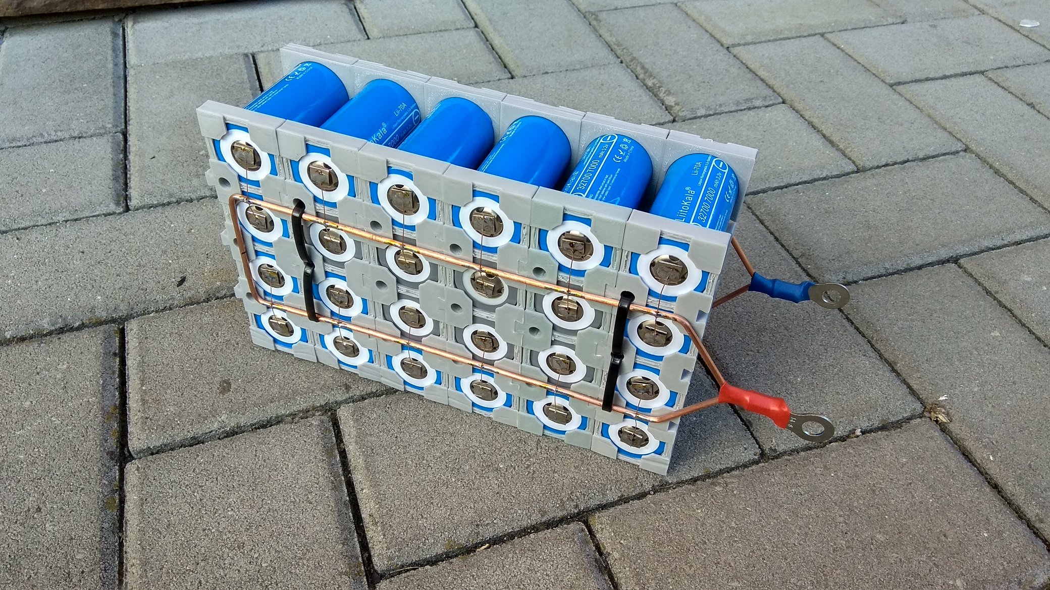 Akumulátory mám dva LiFePo4. Jeden se skládá z 16 článků 100Ah od EV Battery a druhý je skládaný z článků 32700 z Aliexpressu 24p16s kapacity okolo 140Ah. Jednotlivé články jsem propojil (možná zbytečně) přes pojistkové drátky.