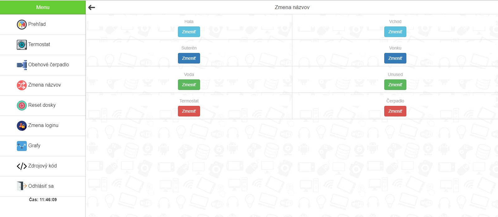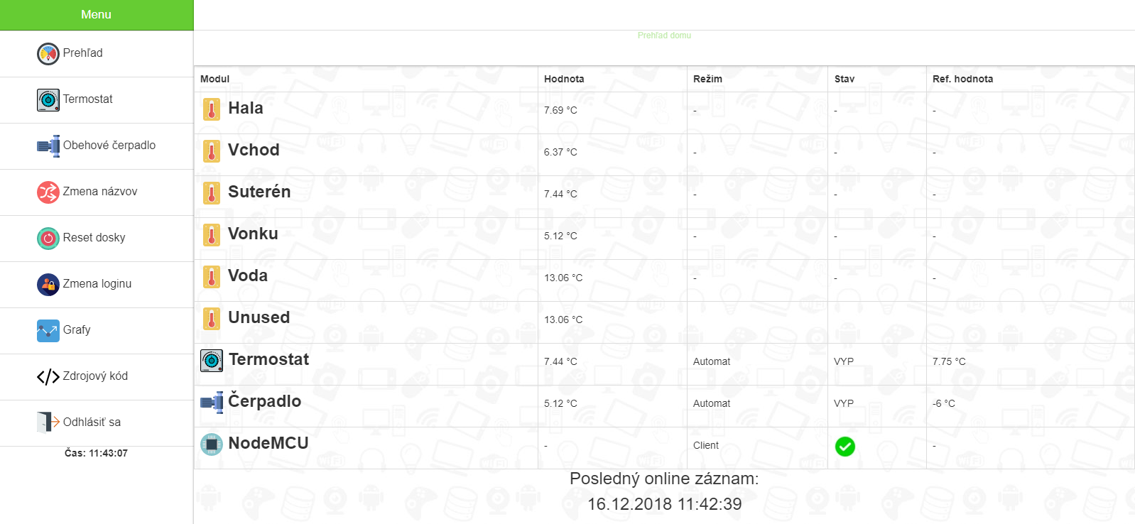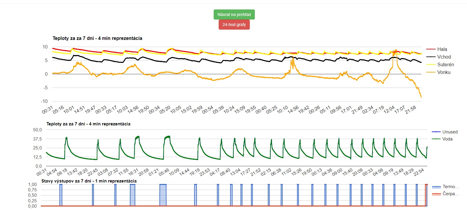 - Prezerať grafy za 24 hodín pre výstupy s minútovou reprezentáciou a pre teploty so 4 minútovou reprezentáciou