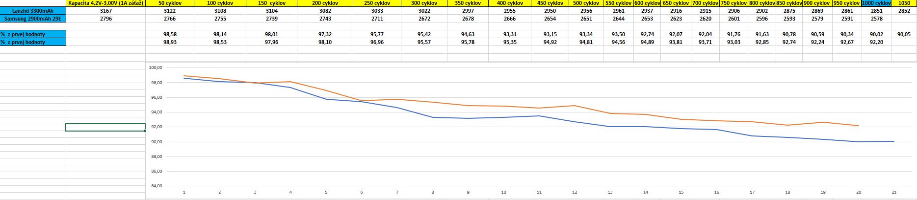 Bol som trochu zaneprázdnený tak pridávam naraz Samsung 1100 cyklov aj Lanzhd 1150 cyklov. V garáži sa už ochladilo na cca 7-9 stupnov. Tam prebieha 50 cyklov ale test kapacity beží pri izbovej teplote. Vždy dva testy a do tabulky ide priemer. V podstate teda má každá batéria nie 1100/1150 cyklov ale o cca 50 cyklov viac.