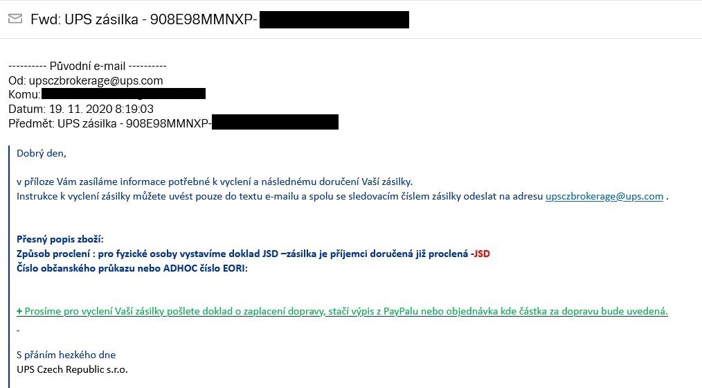 Nicméně dnes mi přišel email z UPS, že mám něco doplňovat ... posílat - volal jsem na tu jejich podporu, ale chlap co se mnou komunikoval mi to teda moc neobjasil - jen opakoval, že mám vyplnit co mi přišlo do mailu.