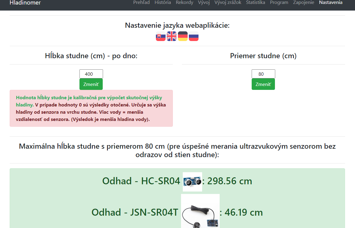 Web rozhranie obsahuje aj záznam rekordov - maximálna, minimálna hodnota hladiny vody za 24 hodín, 7 dní, 30 dní. Webaplikácia má aj rôzne meniteľné údaje - hĺbka studne (slúži ako kalibračná hodnota pre merania), nakoľko vyššia hladina = menšia hodnota medzi hladinou a senzorom, ktorý je umiestnený na vrchu studne. Preto sa touto hodnotou odčítava meranie, aby sa zistila skutočná výška hladiny vody od dna. Druhým meniteľným parametrom je priemer studne, ktorým je možné vykonať prepočet objemu studne v litroch s aktuálnou výškou hladiny a tak odhadnúť maximálnu hĺbku studne pre meranie bez odrazov.