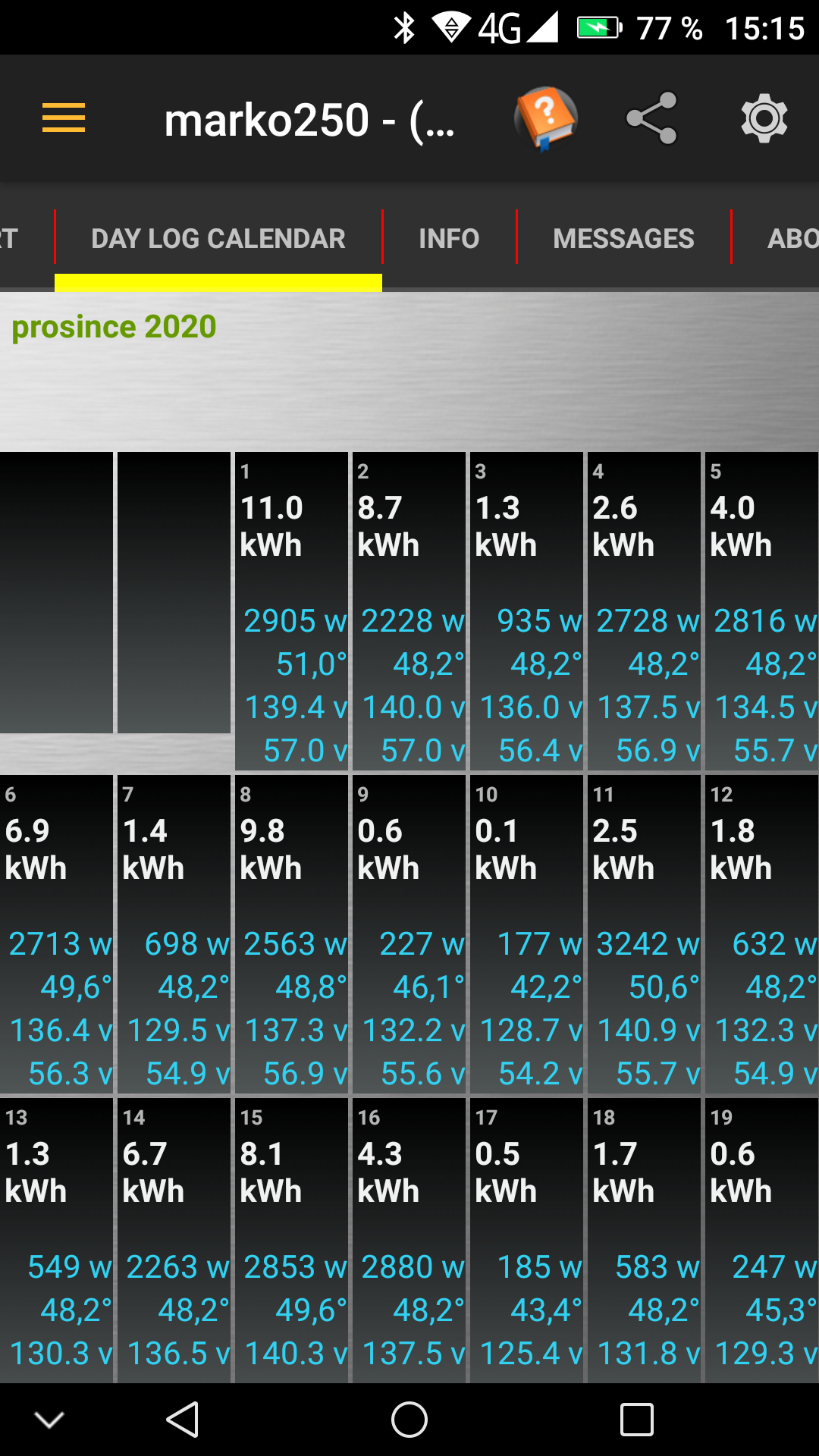 To je bomba!!!marko250 píše:Další rok s rokem se sešel a FVE mi opět nadělila příjemnou porci energie.Letos jsem musel odebrat z DS 412kWh, při nutné potřebě domu 5MWh jsem tedy vykryl 92% a navíc využil všechny přebytky ve dvou klimatizacích,ohřevu AN s bojlerem a jezírku.Za měničem je nyní 21 758kWh a to znamená,že letos se použilo čistých 6 058kWh v AC spotřebě. Duben mohl být čistý,ale výměna měniče nahodila nutnou spotřebu z DS.V příloze roční DC výroba JZ střechy ,která opět potvrdila svůj maximální výkon přez pět kilowat,takže opět bez poklesu.Přibyla JZ fasáda a zateplení,tak se těším na další konec roku a bilanci, v které se to opět projeví.Všem do nového roku hodně zdraví , štěstía mnoho slunce na panelech.
