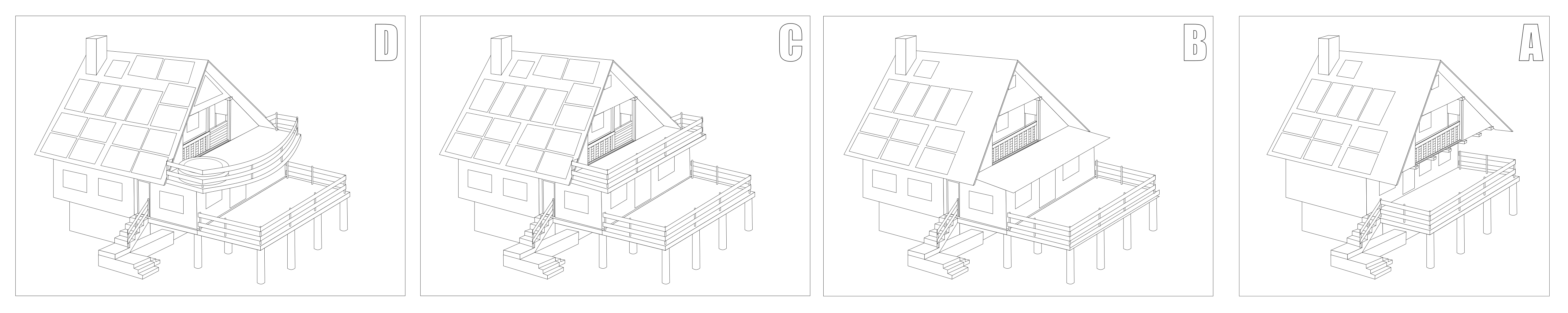Níže přikládám přílohou moje malůvky mé vlastní chaty po paměti kreslené v Inkscape čáru po čáře, žádný 3d, z dávné doby před X lety, které jsem shodou okolností poté ztratil a dnes znovu úplně po haluzi našel. Současný stav je na obrázku A. Konečný stav přechází přes fáze B a C do fáze D.