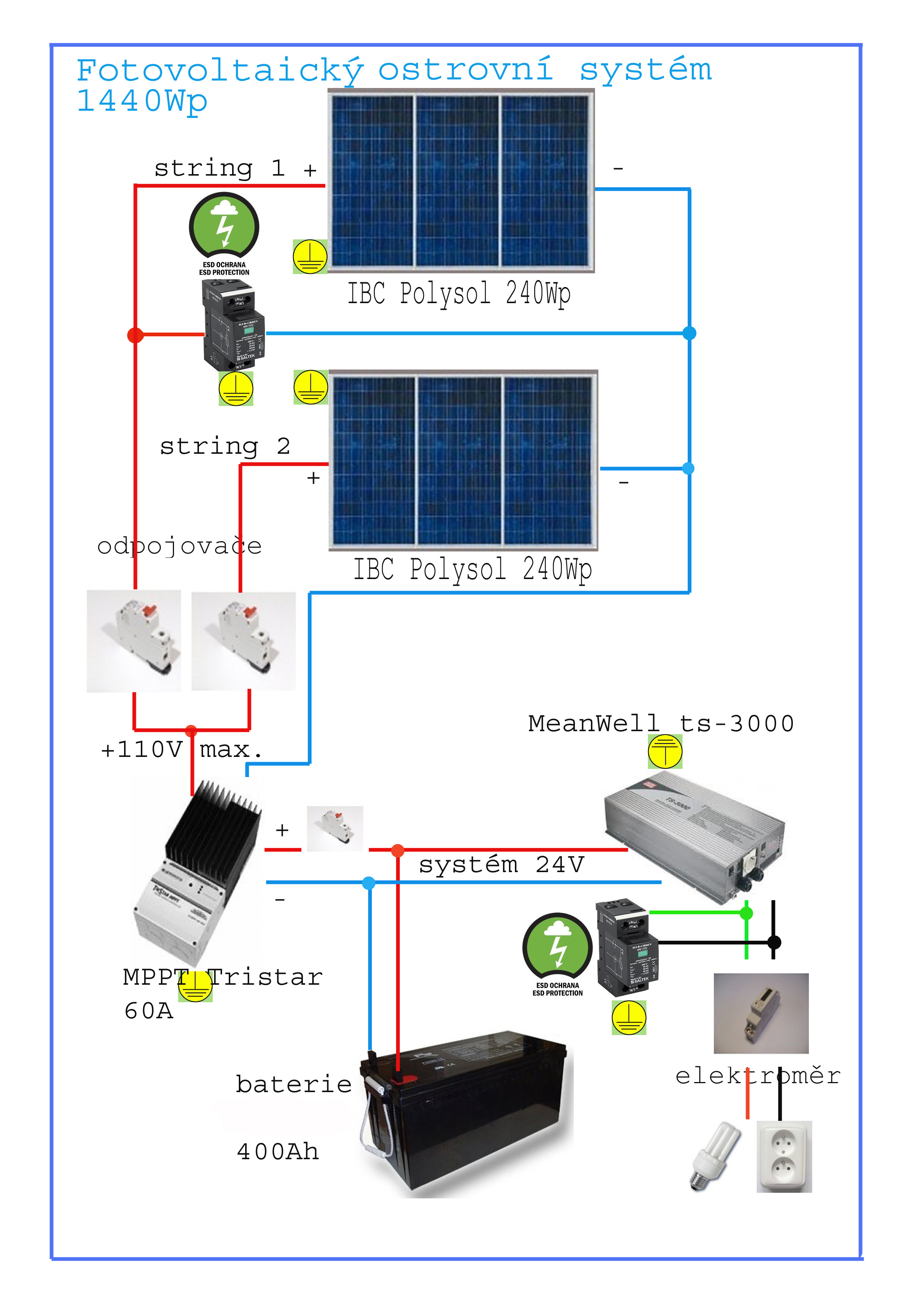 6 x IBC PolySol 240 MS,Tristar MPPT 60,Yucell PG200-12 4ks,MeanWell TS-3000-24.