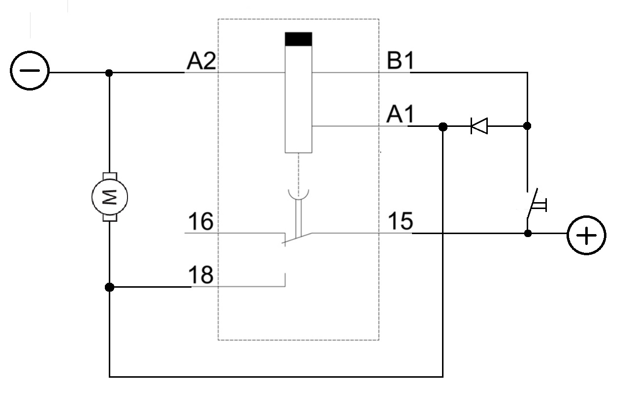 zapojení je prosté, - přívod na A2, tlačítko jedním koncem na + a na + i svorku 15, druhej konec tlačítka na B1, dioda z B1 (anoda) na(katoda) A1, na vývod 18 spojit s A1 a na ventilátor. Samozřejmě může být A1 zapojenej na + pořád, ale bude to mít pár mA klidovou spotřebu...
