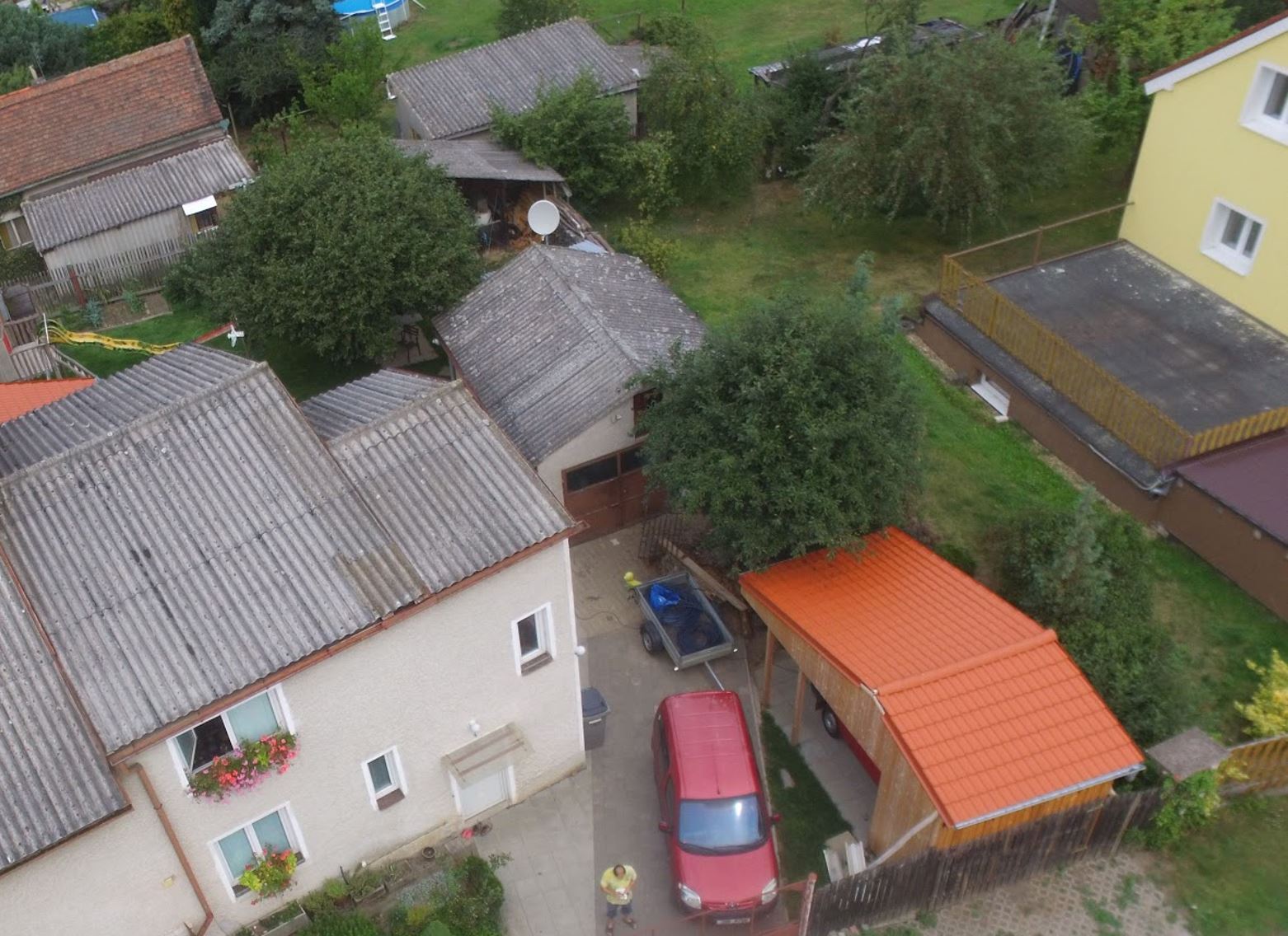 Pro představu přikládám fotografie. Vlevo vpředu je dům. To červené vpravo je přístřešek na auto, zatím je garáž a úplně vzadu je "zahradní altán".